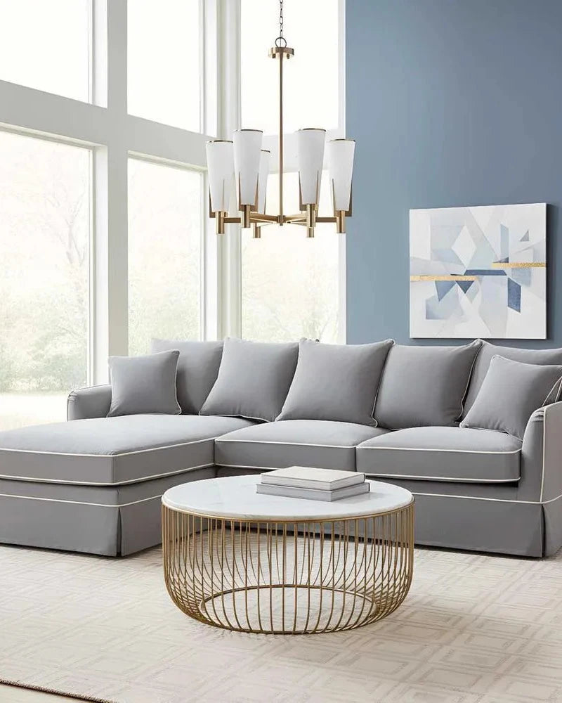 Modern living room with a gray sectional sofa, round wire coffee table, and abstract art on the wall.