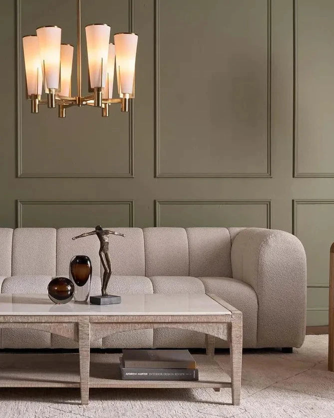 Modern living room with a chandelier, sofa, coffee table, Brass and Glass Loops Chandelier