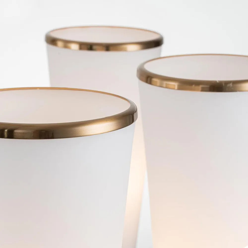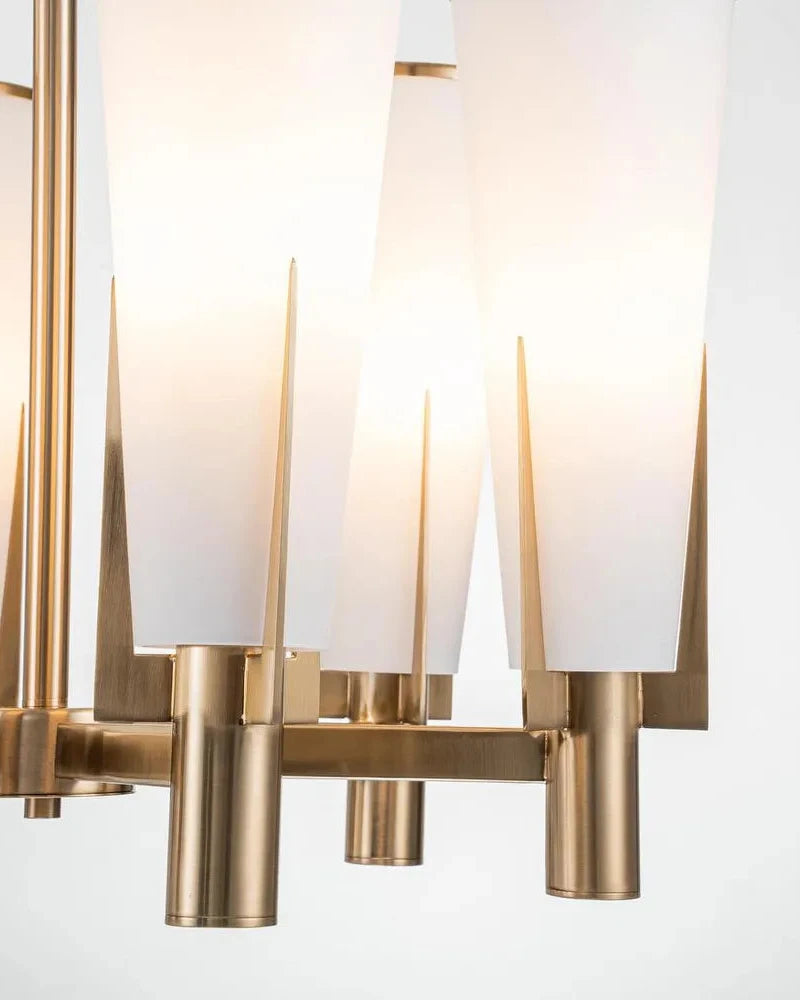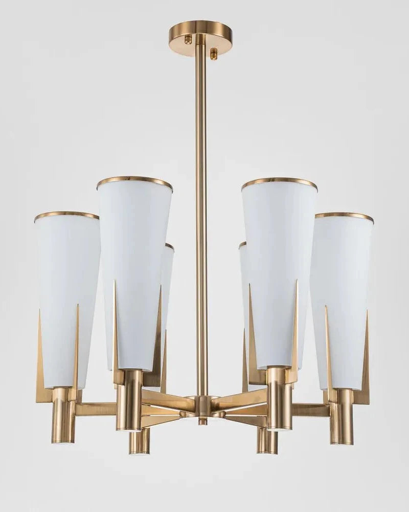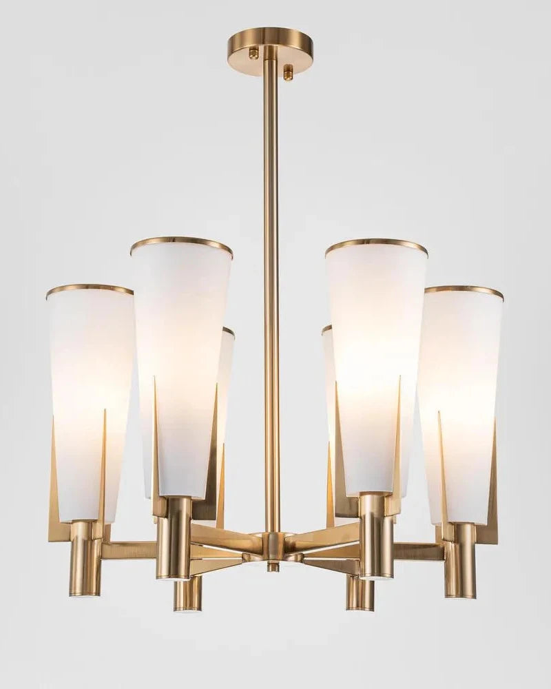 Made from robust iron with a brass finish, this chandelier inspired from Hamptons and mid-century styles with a modern twist will make a statement in bedrooms, living rooms, dining rooms or entrance halls. Elevating interiors with style and grace, this luminary masterpiece features a sleek structure adorned with six shades made from frosted tapered glass and it will spread a functional yet pleasant light around.