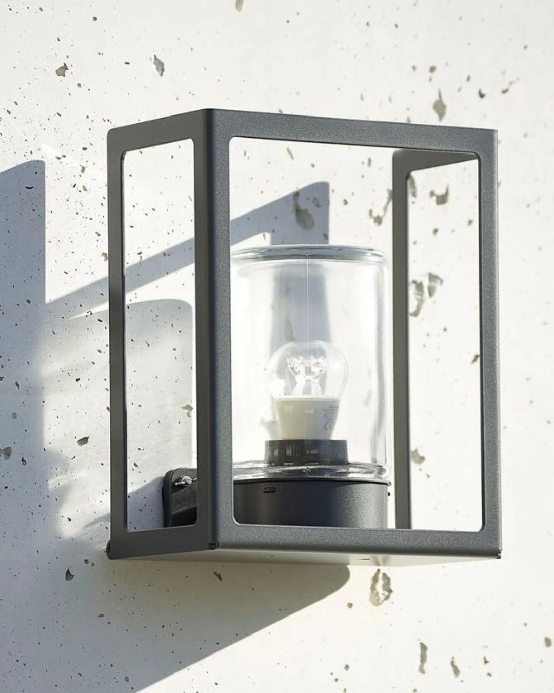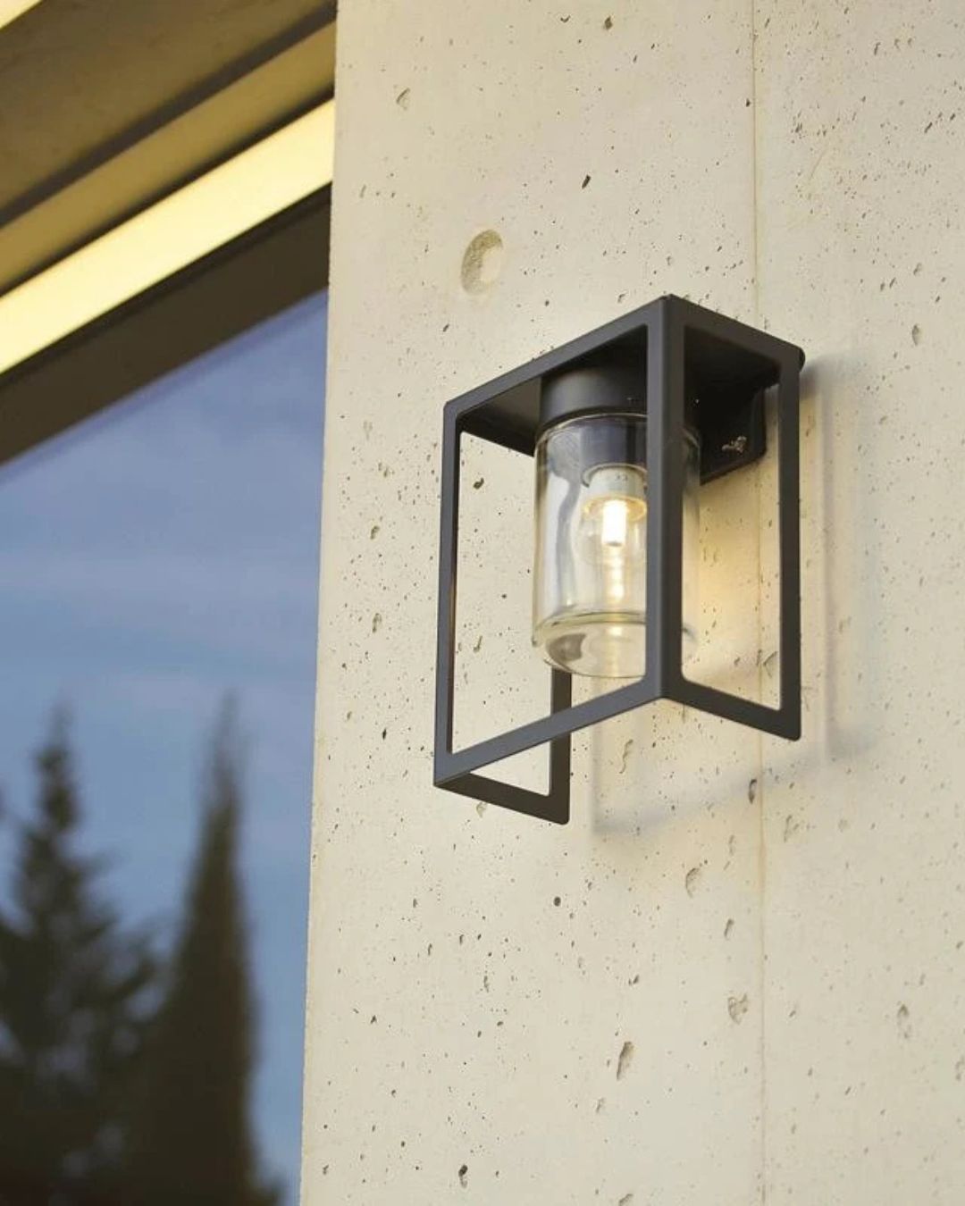 This wall light is a contemporary take on the traditional half wall lantern. The outer frame is open and free from any glass panels and the inner cylindrical glass which protects the globe comes in either a clear or frosted finish. The frame is also available in a dark grey aluminium finish and can be mounted facing up or down.