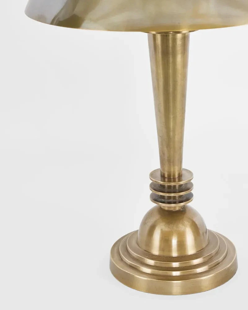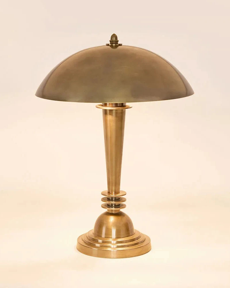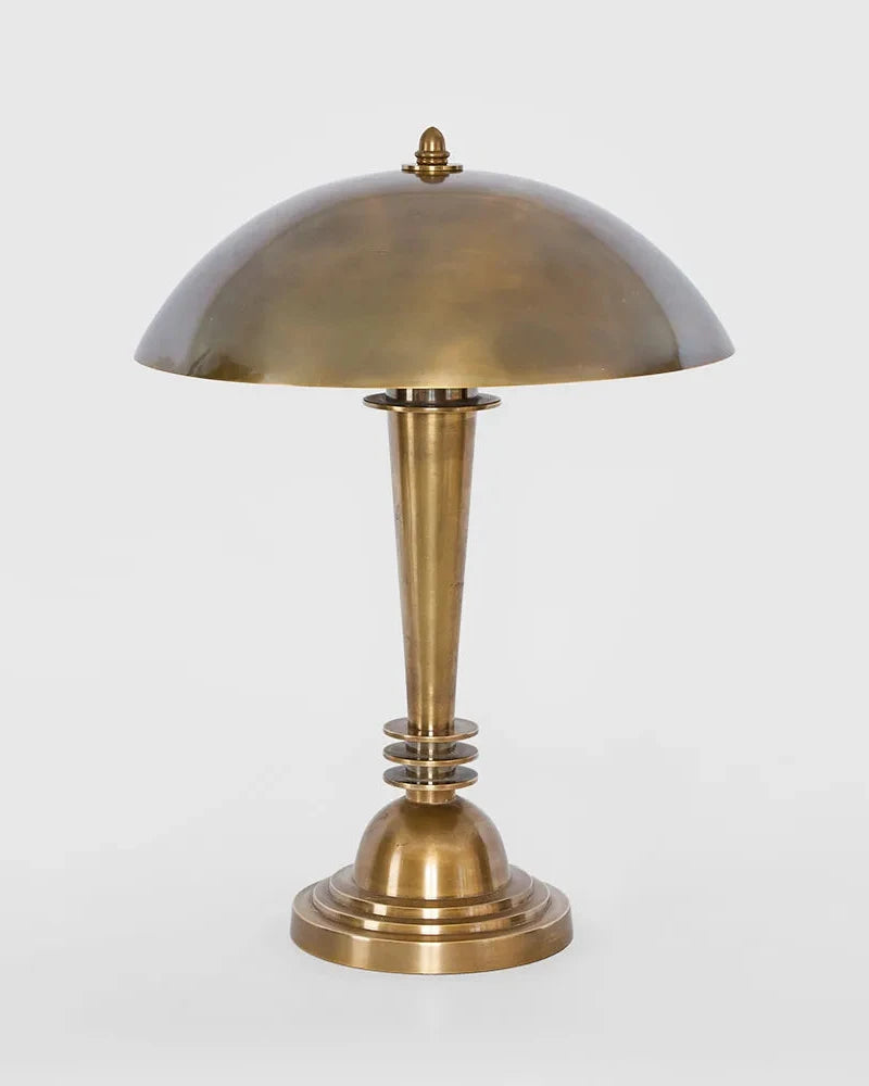This lamp embodies classic Art Deco design, featuring a symmetrical shape and a tiered circular base with a tapered stem and three rings. Its timeless elegance makes it a popular choice for both vintage and modern home interiors. The dome-shaped shade adds an extra touch of sophistication to any eclectic or vintage-style room.