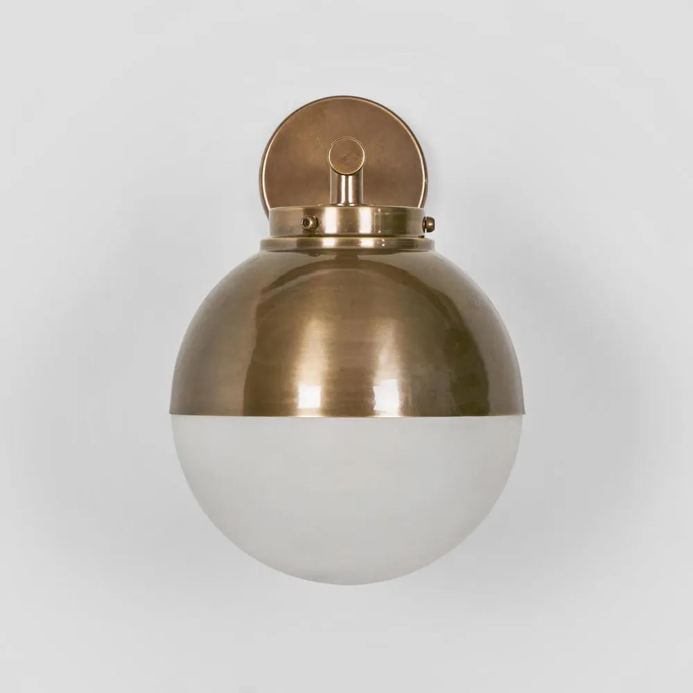 Crafted from solid brass, this wall light features a short arm fixed to a circular base supporting an elegant orb composed of antique brass and glass. Its timeless design and adaptable nature provide an inviting illumination, complementing a range of interior styles including traditional and vintage.