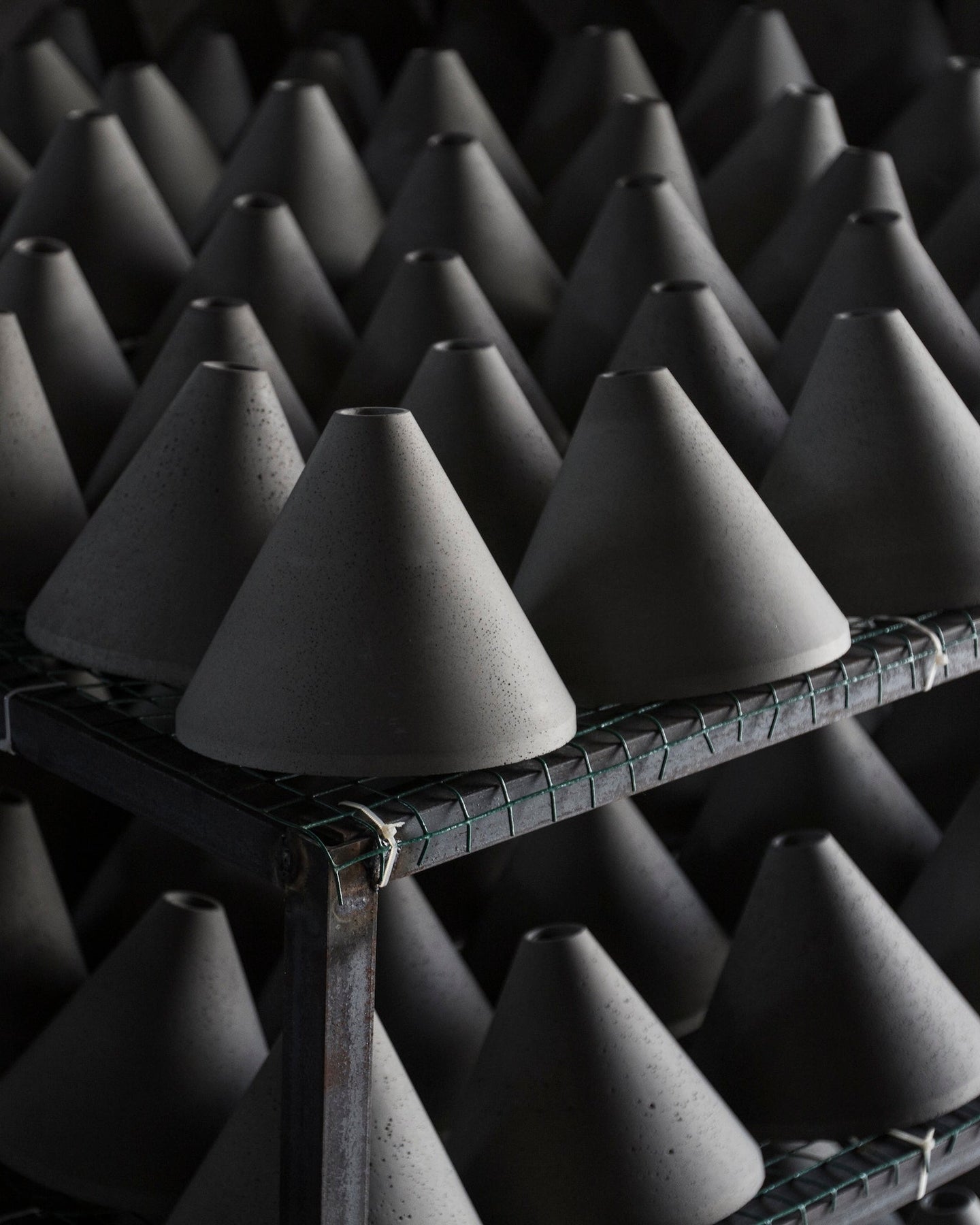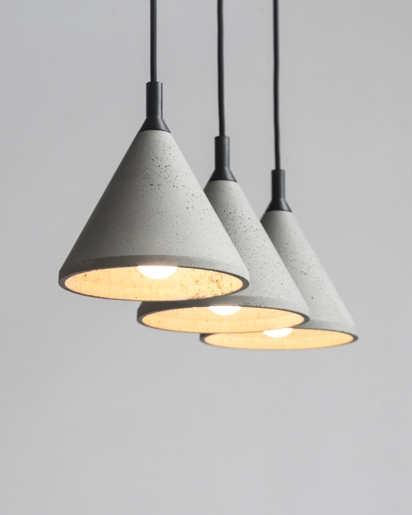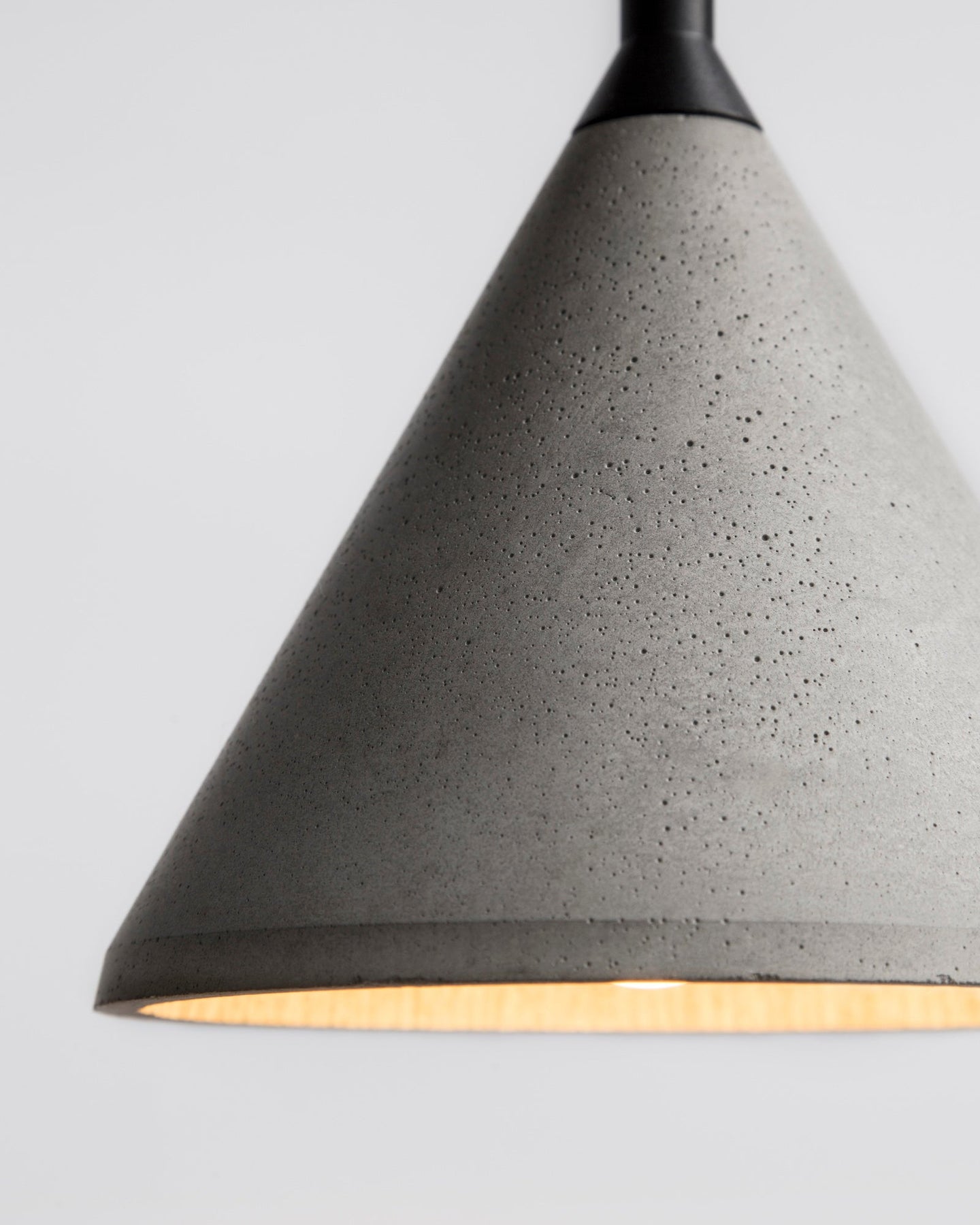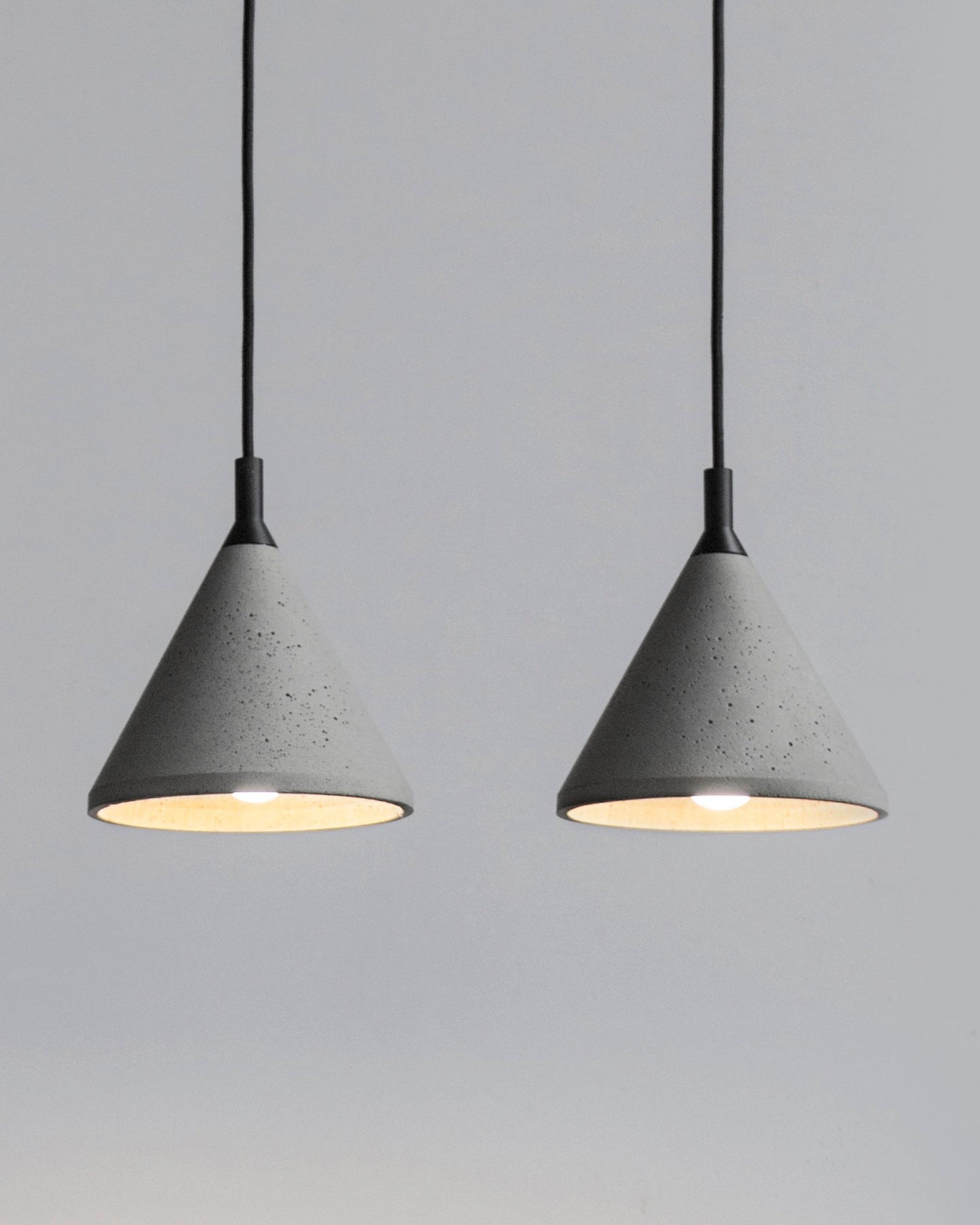 Combining strong geometric shapes with raw materials this fitting offers an effortless cone-shaped form. The proportions of this design make it suited to be installed as a singular pendant or as an arrangement of multiple pendants. Made from recycled concrete the pendant's textured shade is suspended by a black anodised aluminium upper section and a two-meter black braided cable. Due to the materials used, natural variances in the texture and colour of this recycled concrete pendant may occur these variations are expected and are to be celebrated, making each pendant unique.
