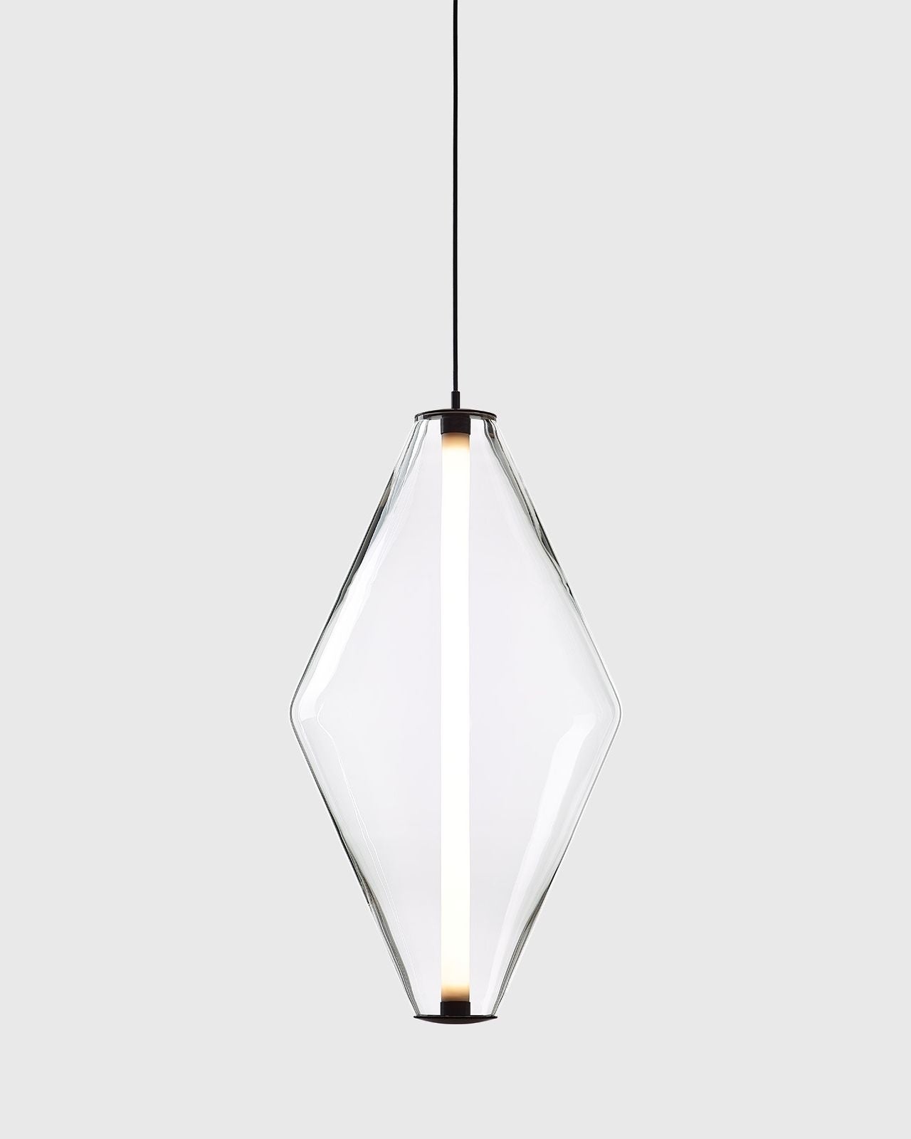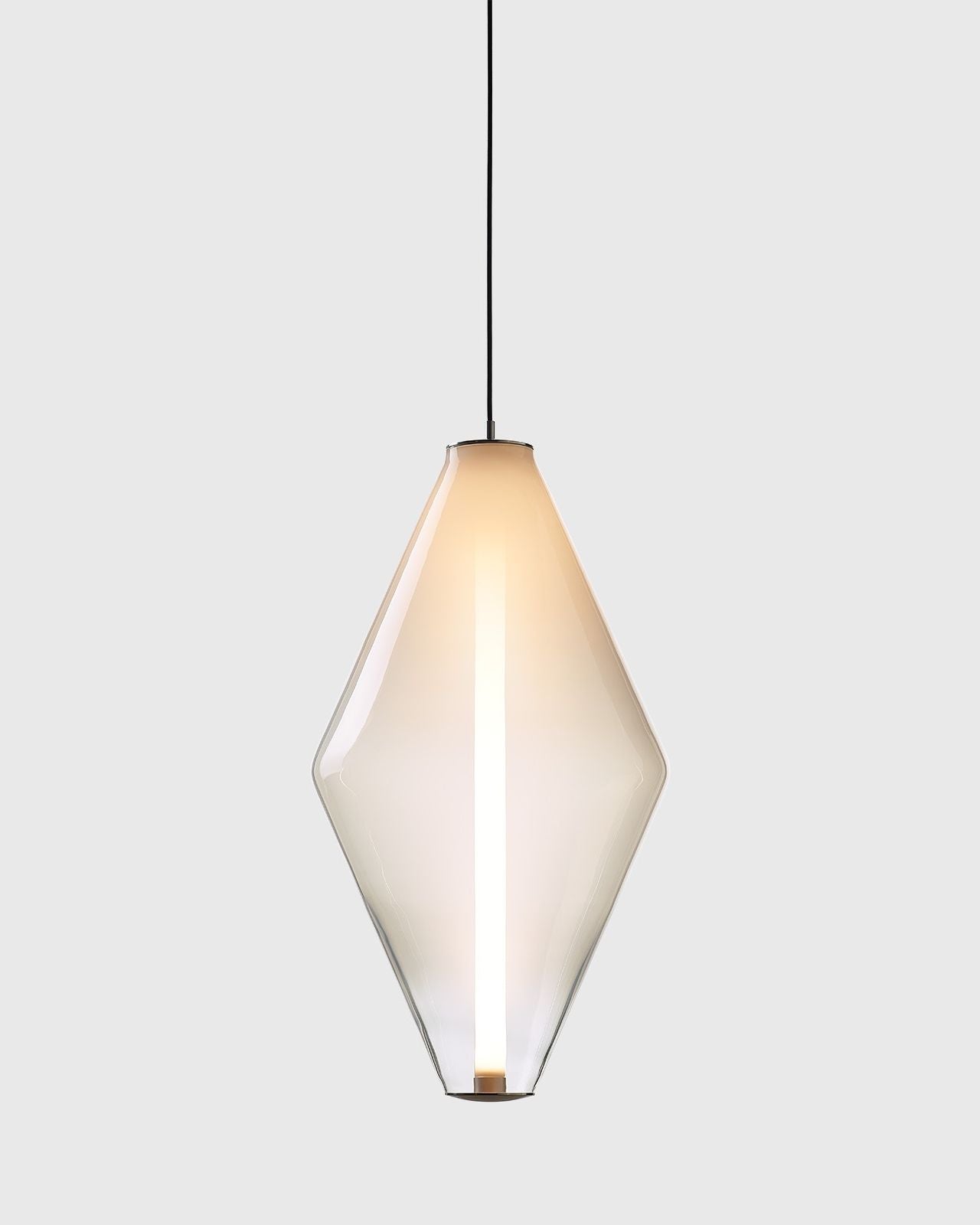 Inspired by buoys that served as orientation point for sailors during days and nights, this geometric and minimalist pendant was designed by Václav Mlynář. Crafted from hand-blown clear, white or smoked crystal glass, this double cone light features a unique rod made from sandblasted polycarbonate at the centre allowing the light to evenly run through the body. To add some refinement, this fixture also includes black or silver aluminium fitting. Looking great on its own, it can also make a statement as a cluster playing with finishes.