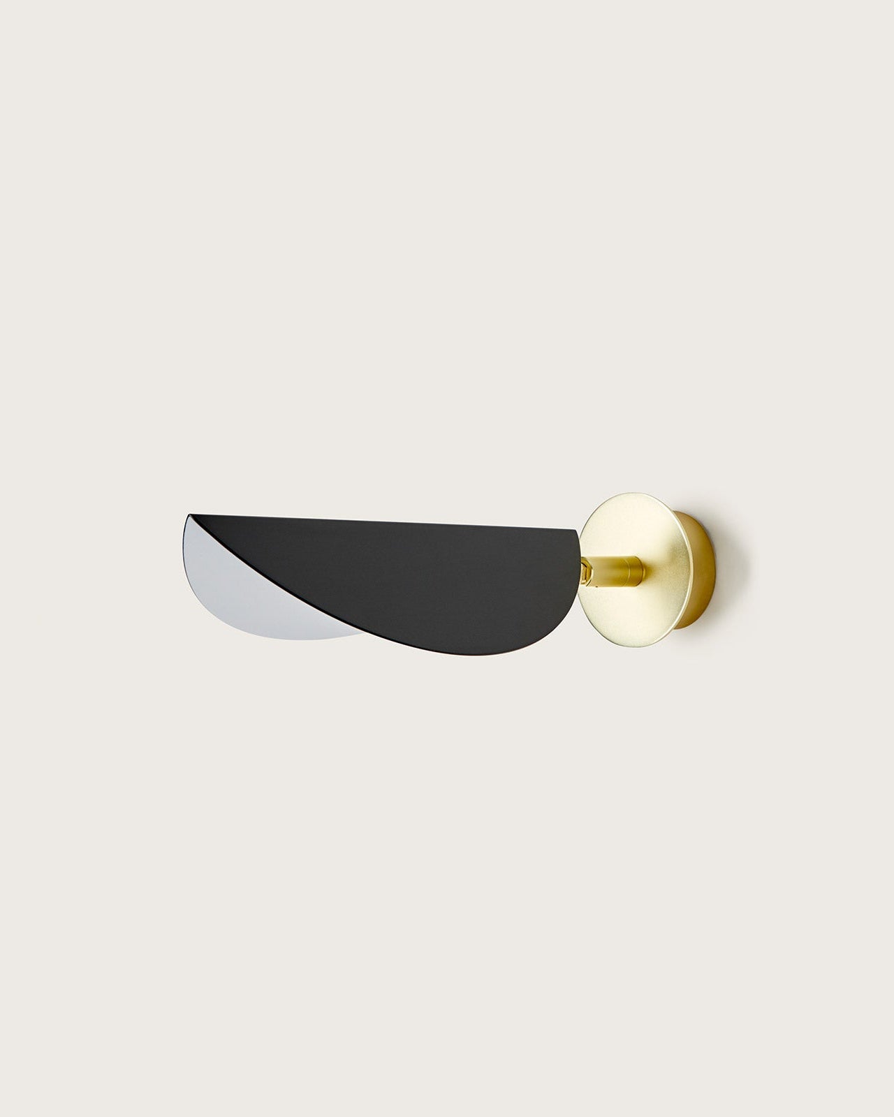 Made from folded steel this design showcases a minimalist form with a matte black shade and matte brass arm. Featured with a 5W G9 LED this wall light provides warm downwards illumination suited for both residential and commercial environments. Applied as a singular fitting or multiple pieces lining wall this fitting is well suited for contemporary styled interiors.