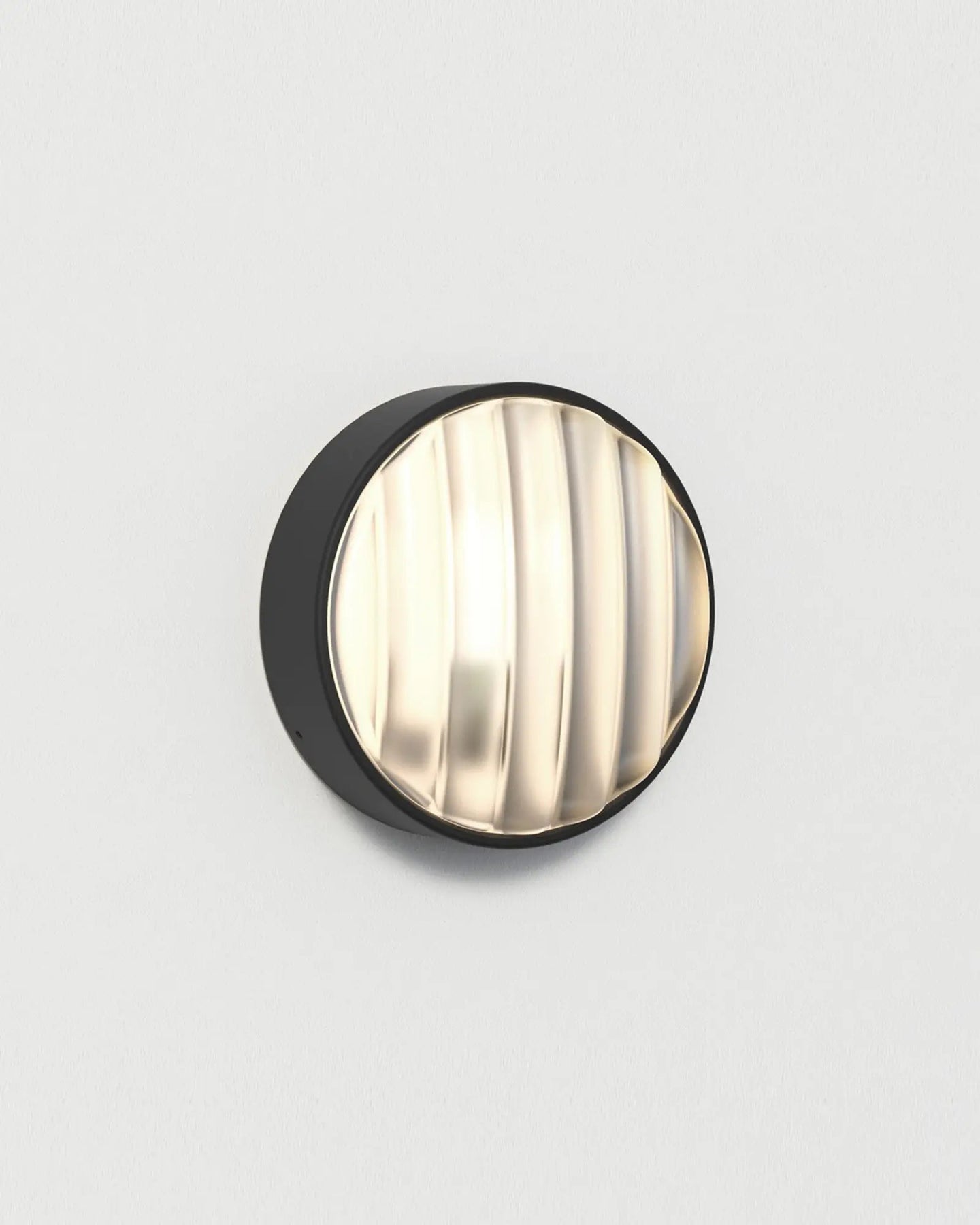 This bunker-style light showcases a modern industrial design. Paired with a sand-blasted wide-ribbed glass diffuser and finished in a textured black, this wall light is ideal for illuminating exterior pathways, garage walls or outdoor entertainment areas.  Available in a 220mm and 300mm diameter option.