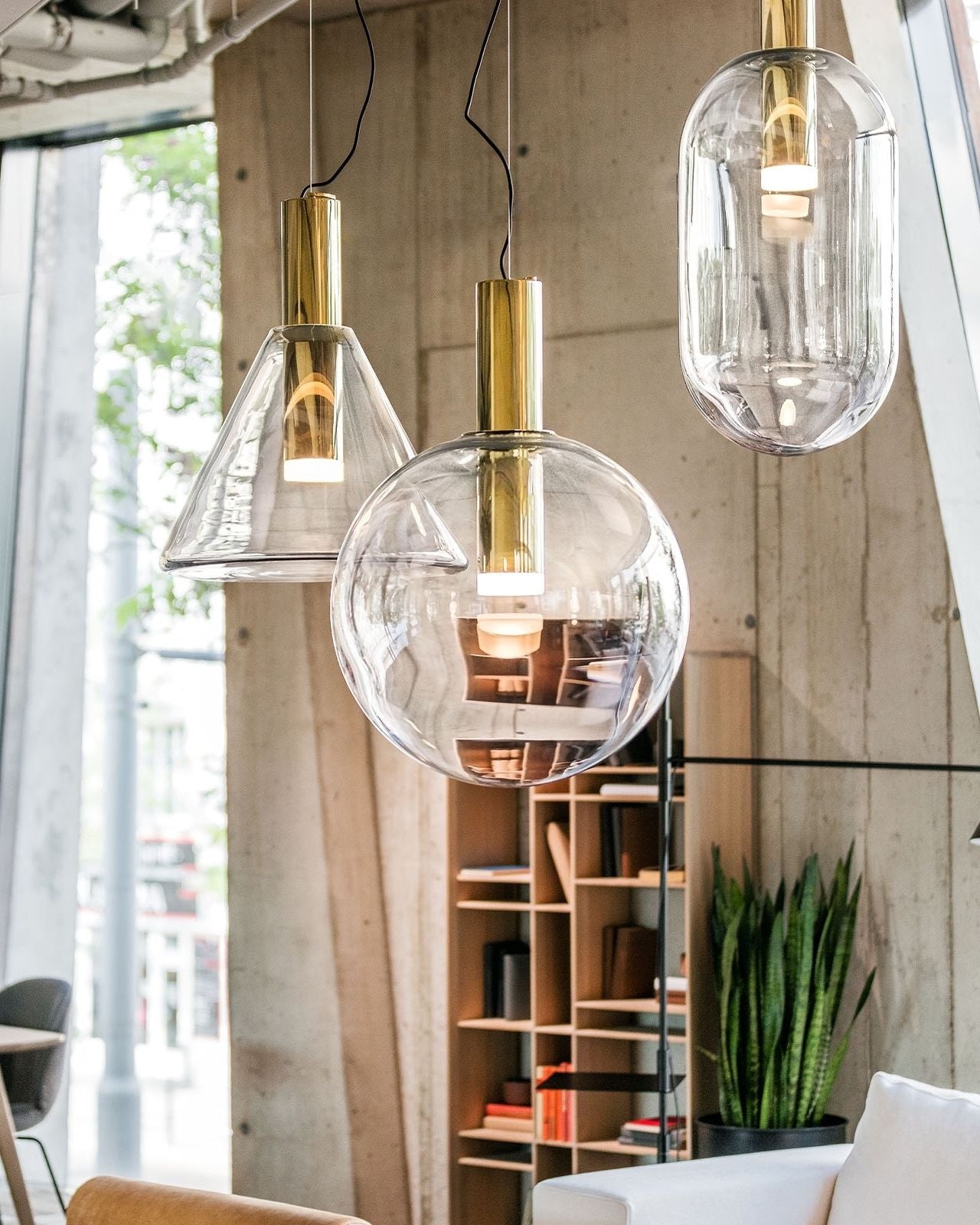 Frosted Tubular Brass Suspended Pendant 3 Light variant in a changing room