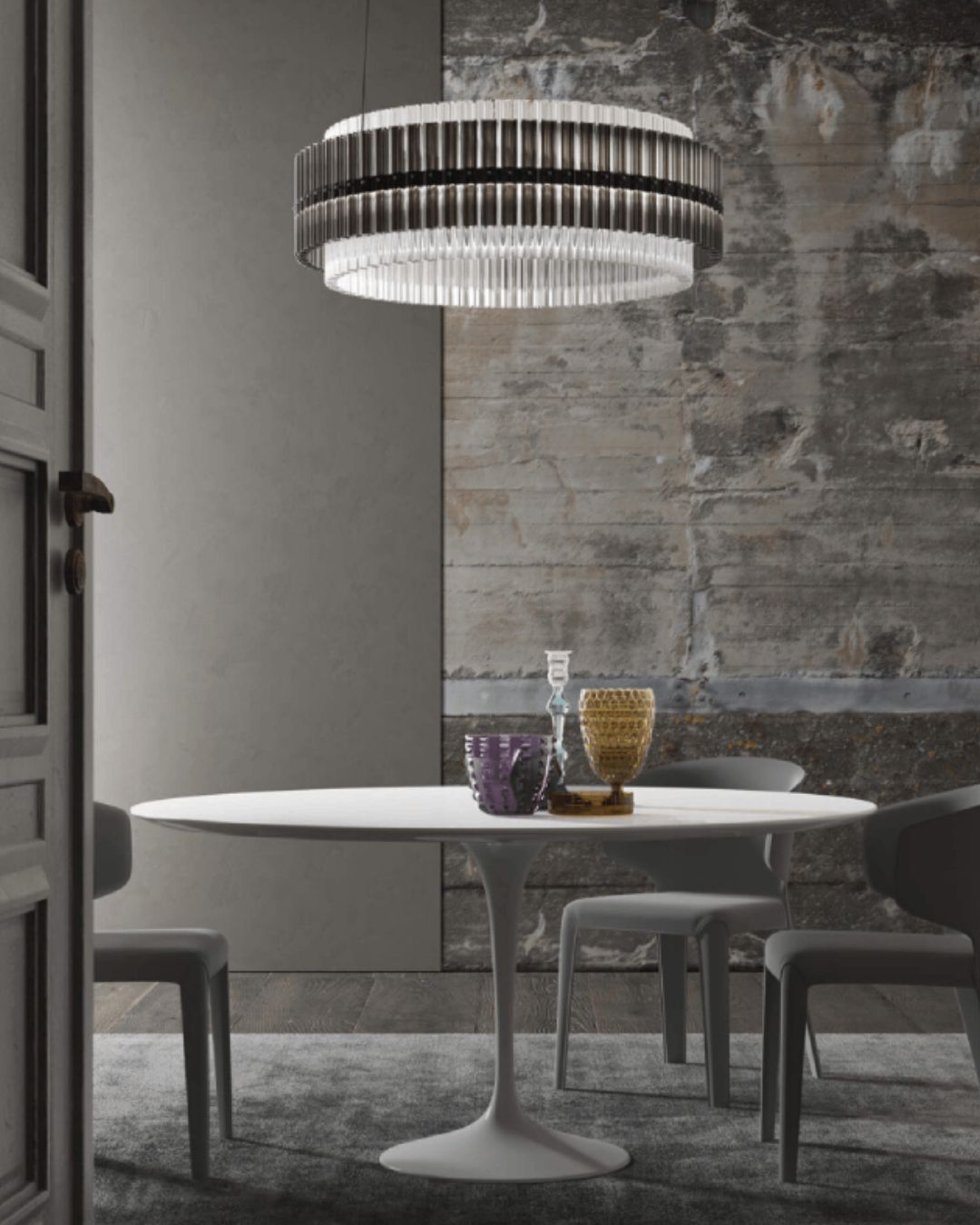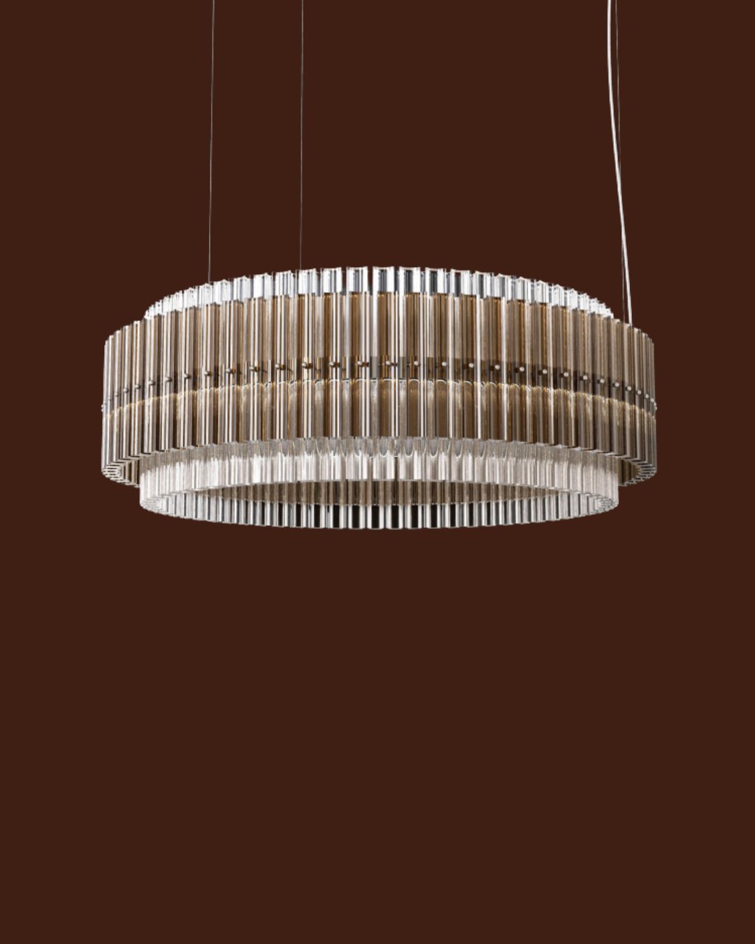 Creative and contemporary twist of a classic chandelier, this fixture will be a statement piece in living rooms, dining rooms or bedrooms. Made from metal with a chrome finish, the circular frame hosts several rows quadrihedrons made from Murano glass with a transparent, amber or teak finish. Bringing a modern and elegant touch to interiors, this sophisticated masterpiece will spread a pleasant soft and warm light around. The integrated LED module ensures a low energy consumption and a high-quality illumination.