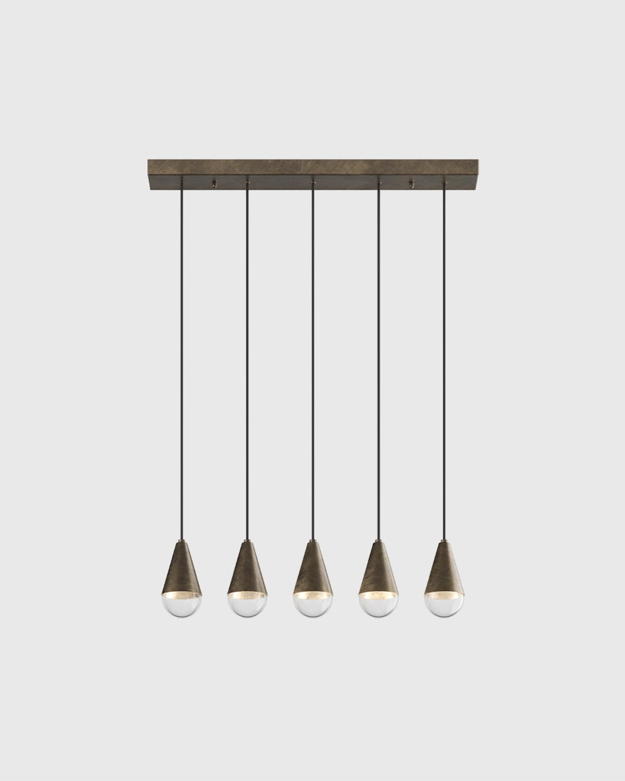 The Iron Teardrop Linear Pendant features five teardrop-shaped shades in a clean, modern design. The shades combine an iron top half with a clear glass bottom half, blending masculinity and femininity. The rounded glass diffuses light evenly, creating a warm and inviting atmosphere, while the adjustable suspensions make it easy to fit a variety of ceiling heights, offering flexibility for kitchens, dining rooms, or commercial spaces.