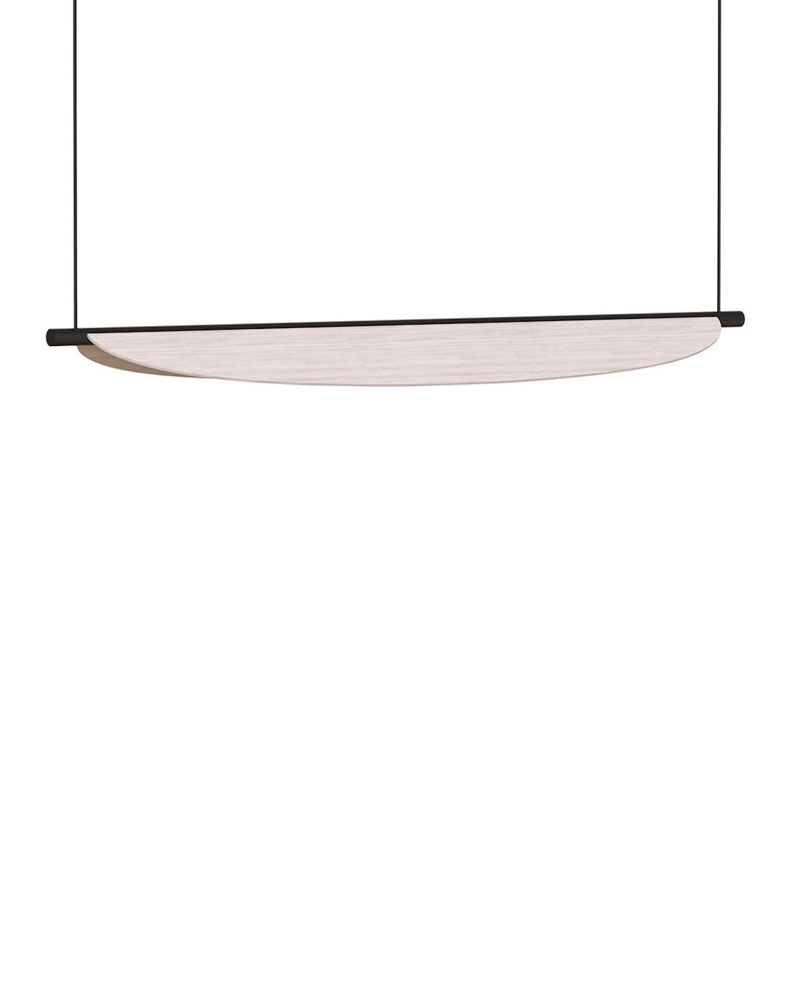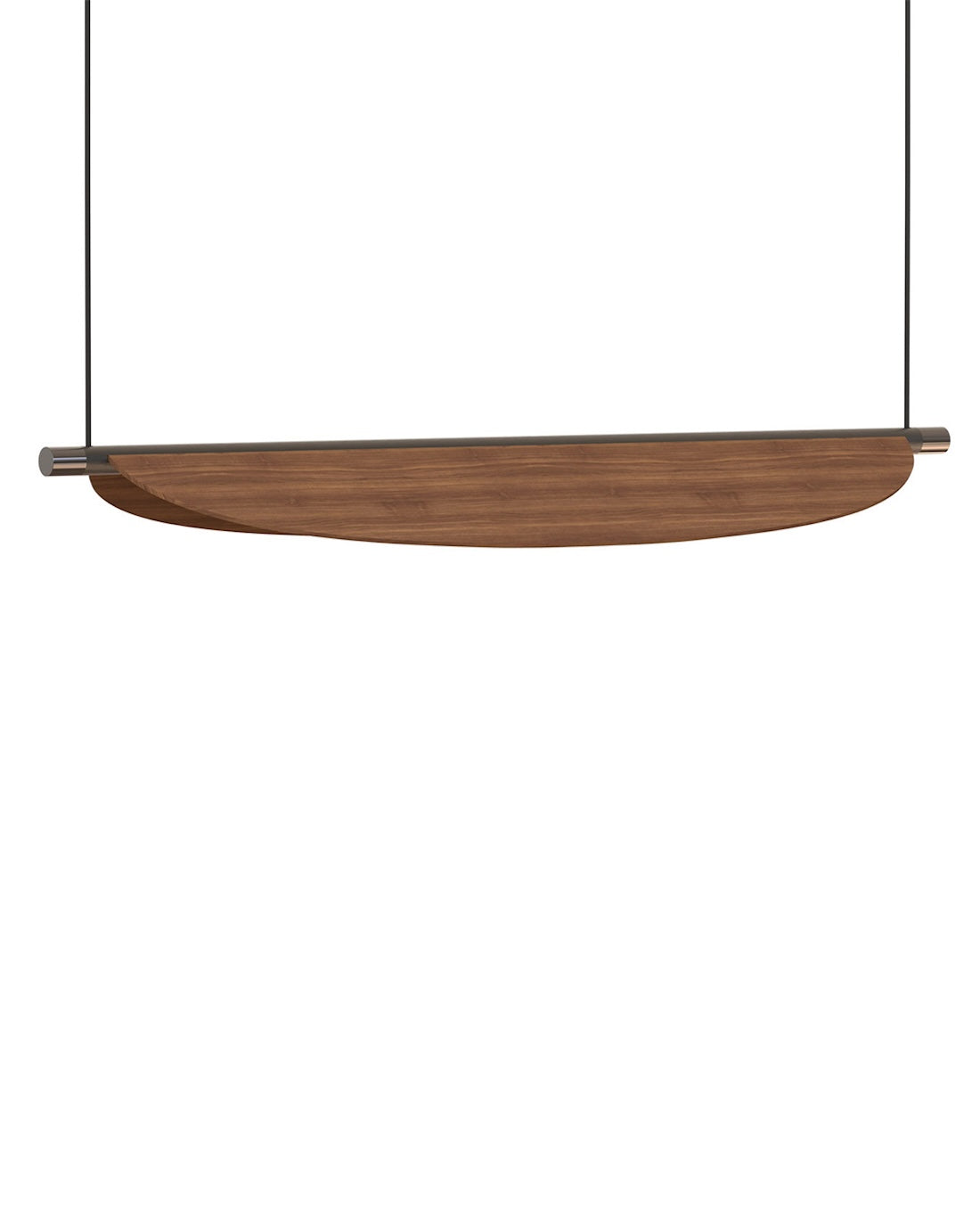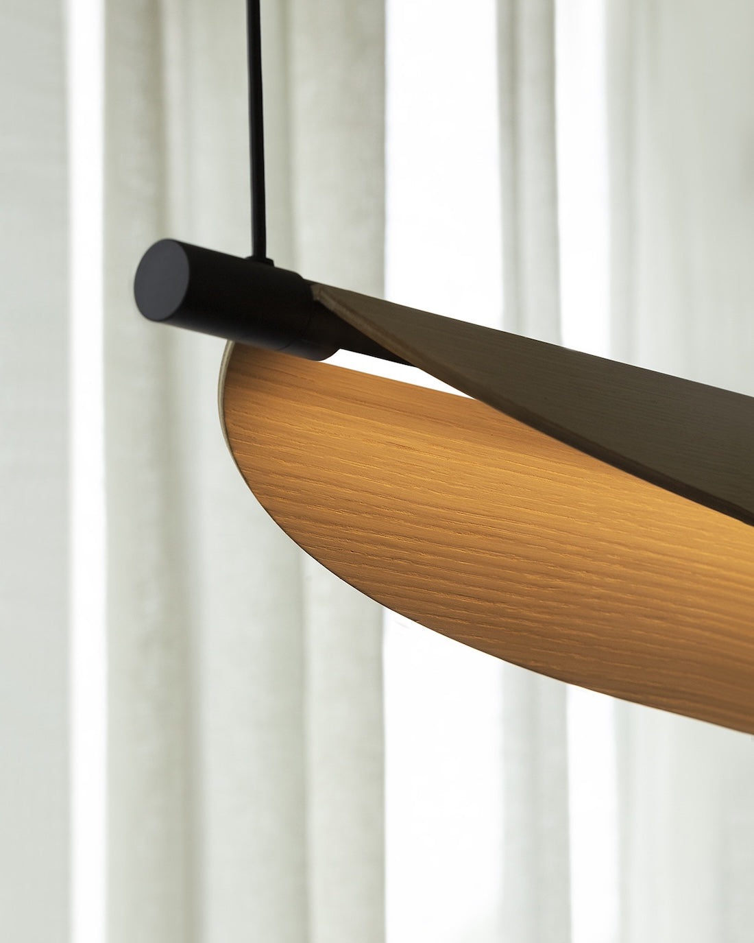 Close-up of a wooden pendant with a black bracket against a white curtain background