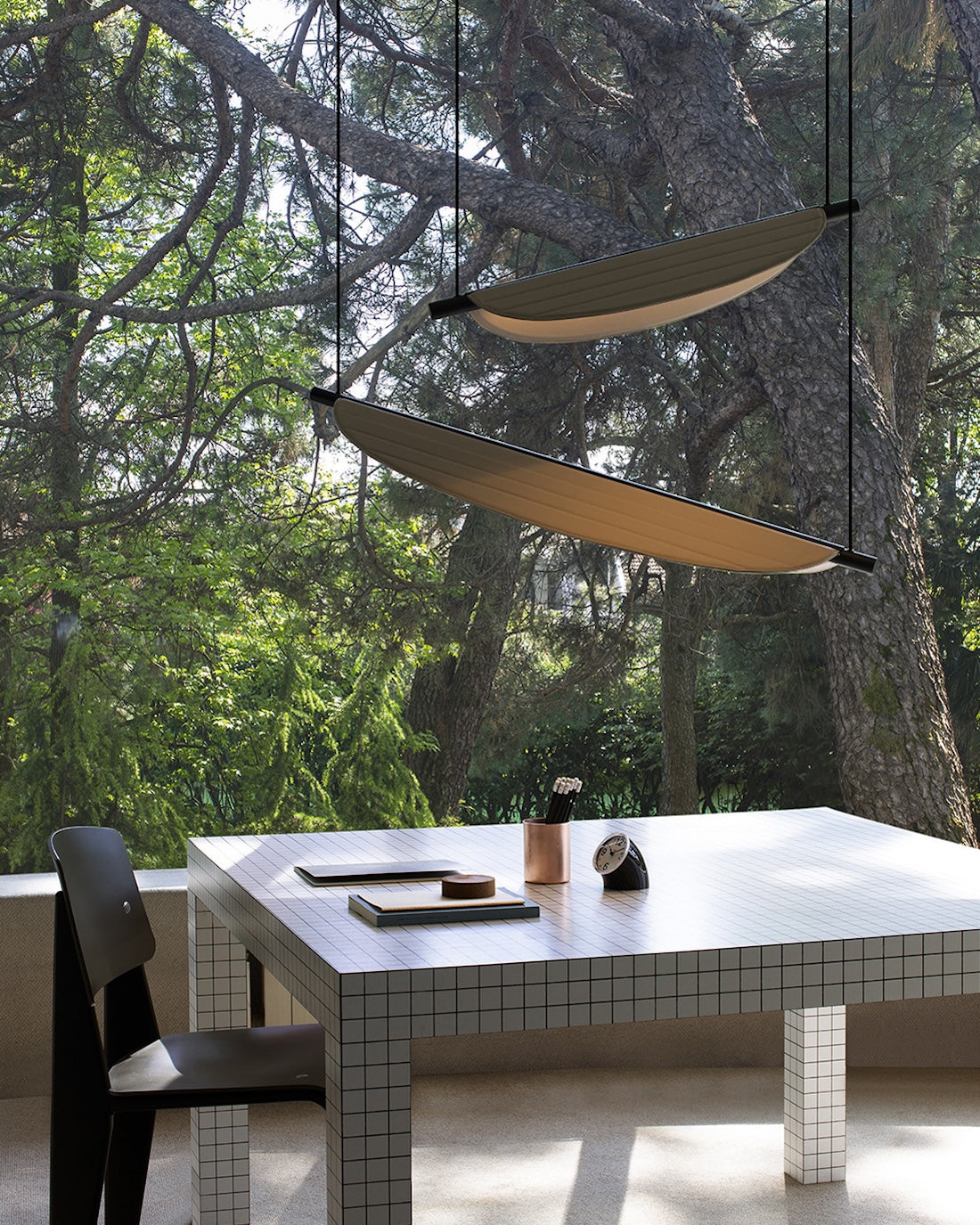 Two hanging pendants above a modern outdoor dining table with a scenic background.