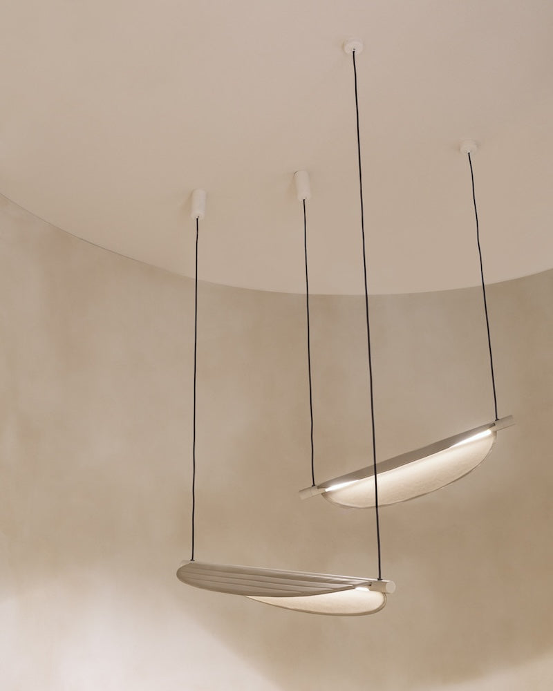 Handmade Wavy Circular Chandelier | Ripple fixture on a beige wall with a wooden surface below.