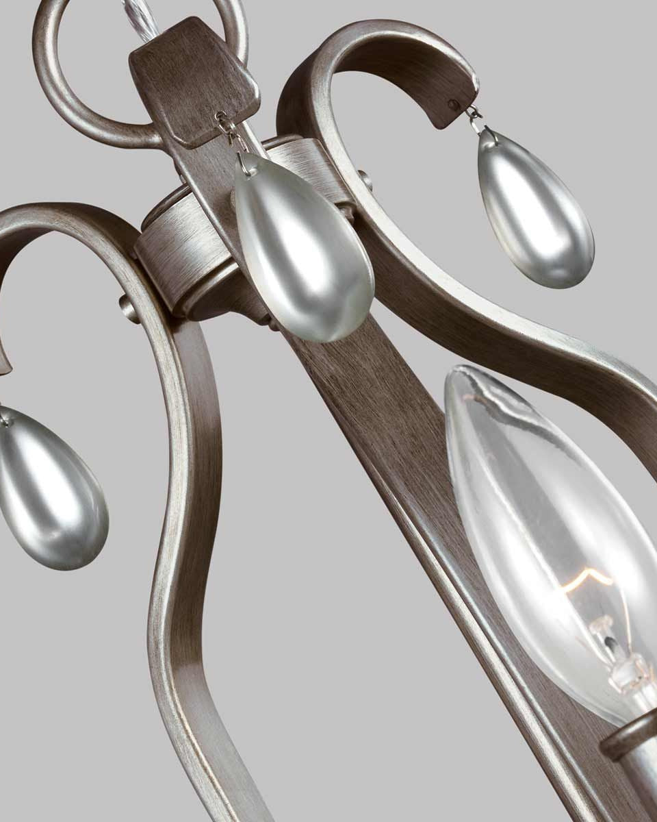 This lustrous Chandelier is reminiscent of provincial France displaying romantic curved lines, candle-like light sleeves and stunning teardrop detail. The traditional design has been amplified with a modern Sunrise Silver finish to amplify the elegant silhouette. Make a spectacle of this stunning Chandelier in your living room, above your dining table or in your foyer. Available in 3, 4, 5 or 9 light variants.