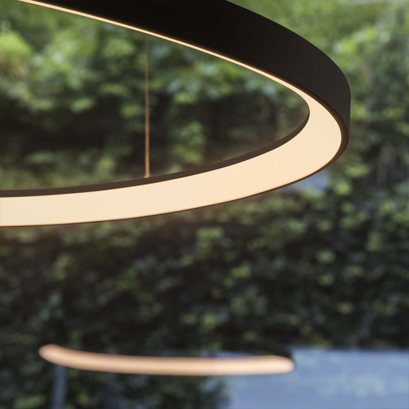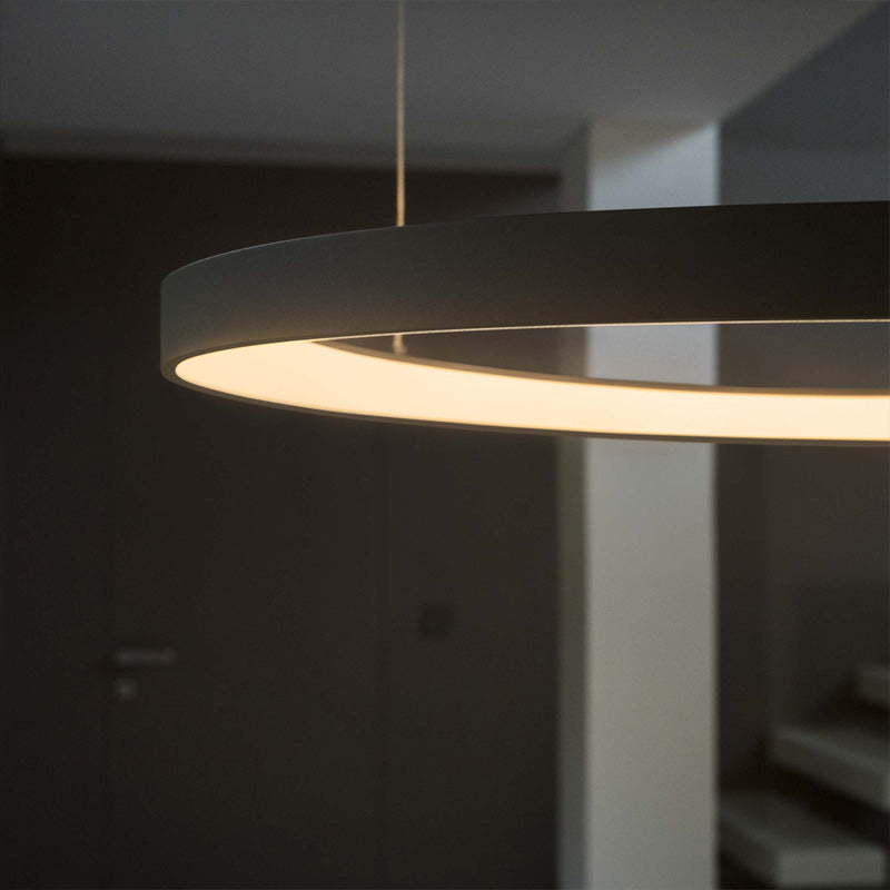 Modern and elegant, this refined pendant features a sleek powder coated or plated metal ring. Floating in the air, this fixture will easily enhance a living room, a dining room or a bedroom. While the frame is available in white, black or brushed brass finish, the opal polycarbonate diffuser integrating a LED module will allow to spread a nice glare-free and soft light around.