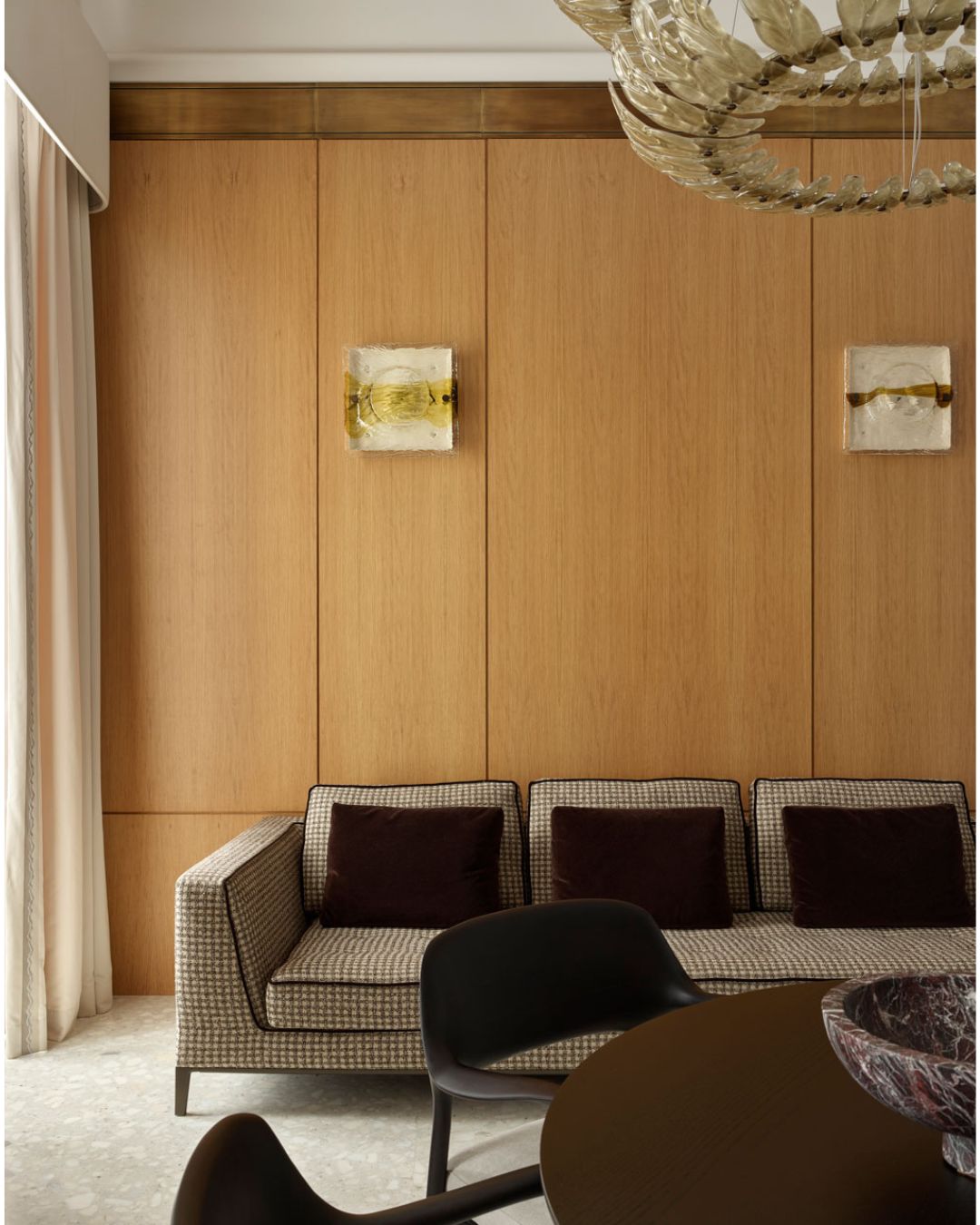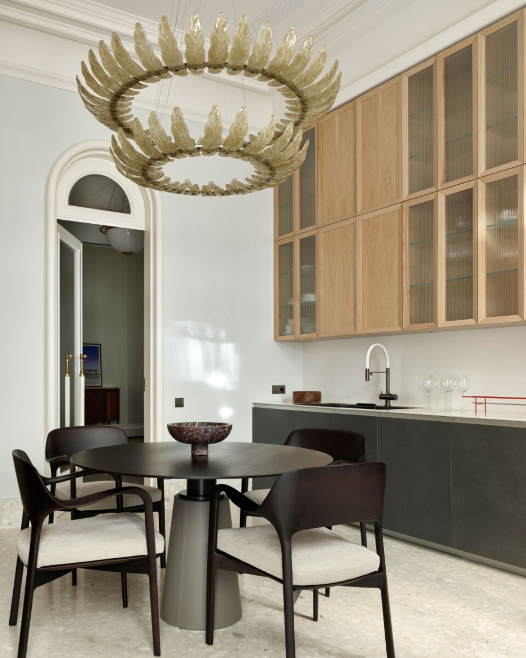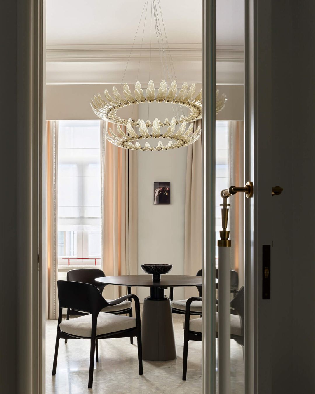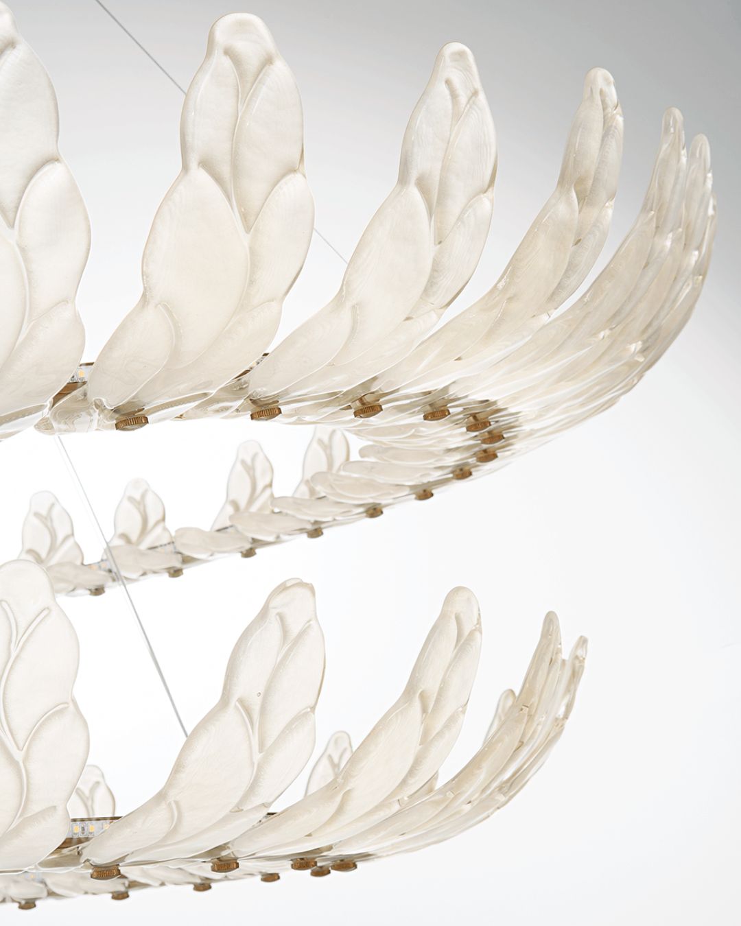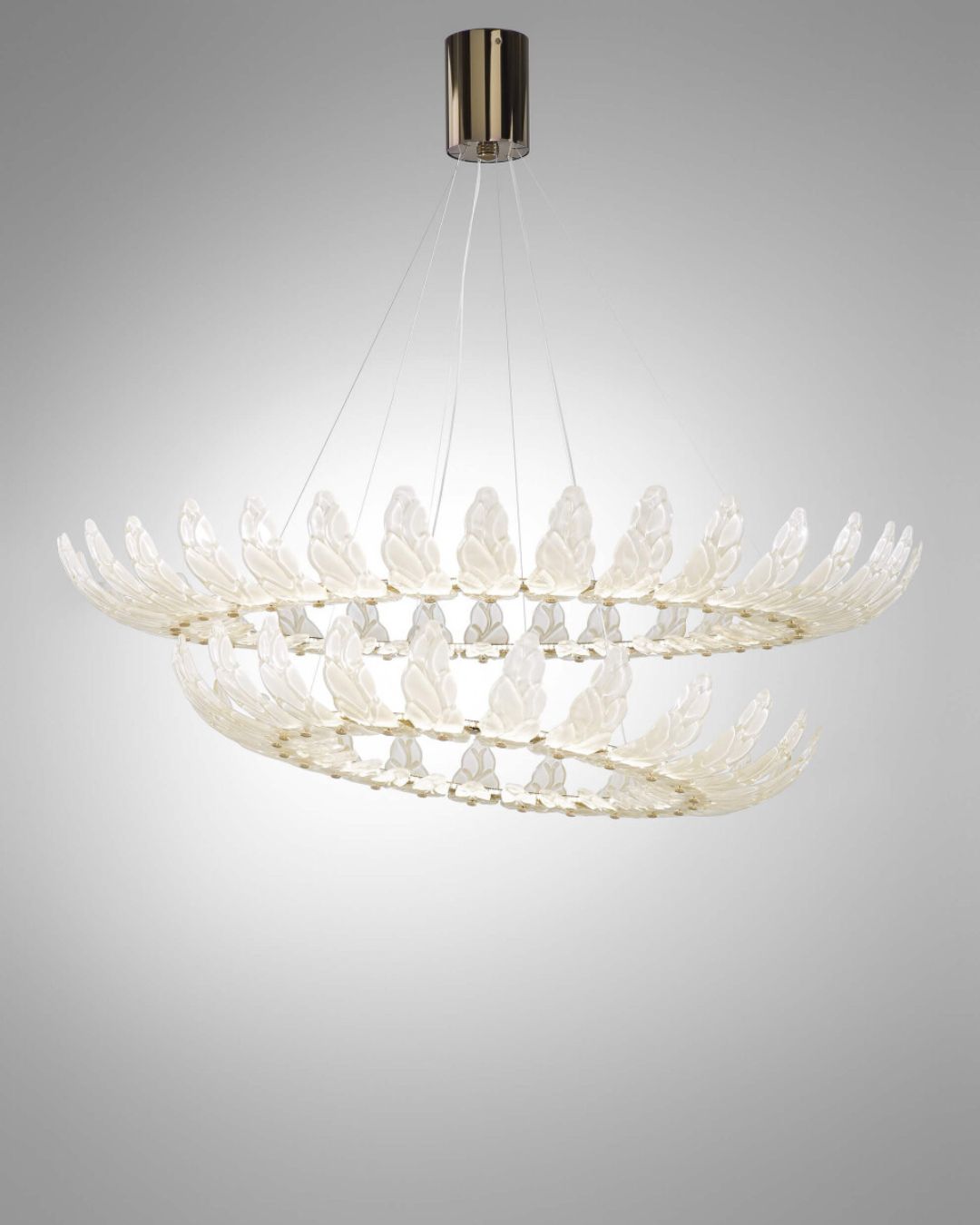 Elegantly displayed next to each other on two circles made from gold nickel, the satin glass leaves are revisited in contemporary style. The metal structure also hosts the LED source spreading a perfect illumination above a dining table, in a living room or in a large entrance hall. This unique and refined chandelier will make a striking statement in classic or contemporary interiors.
