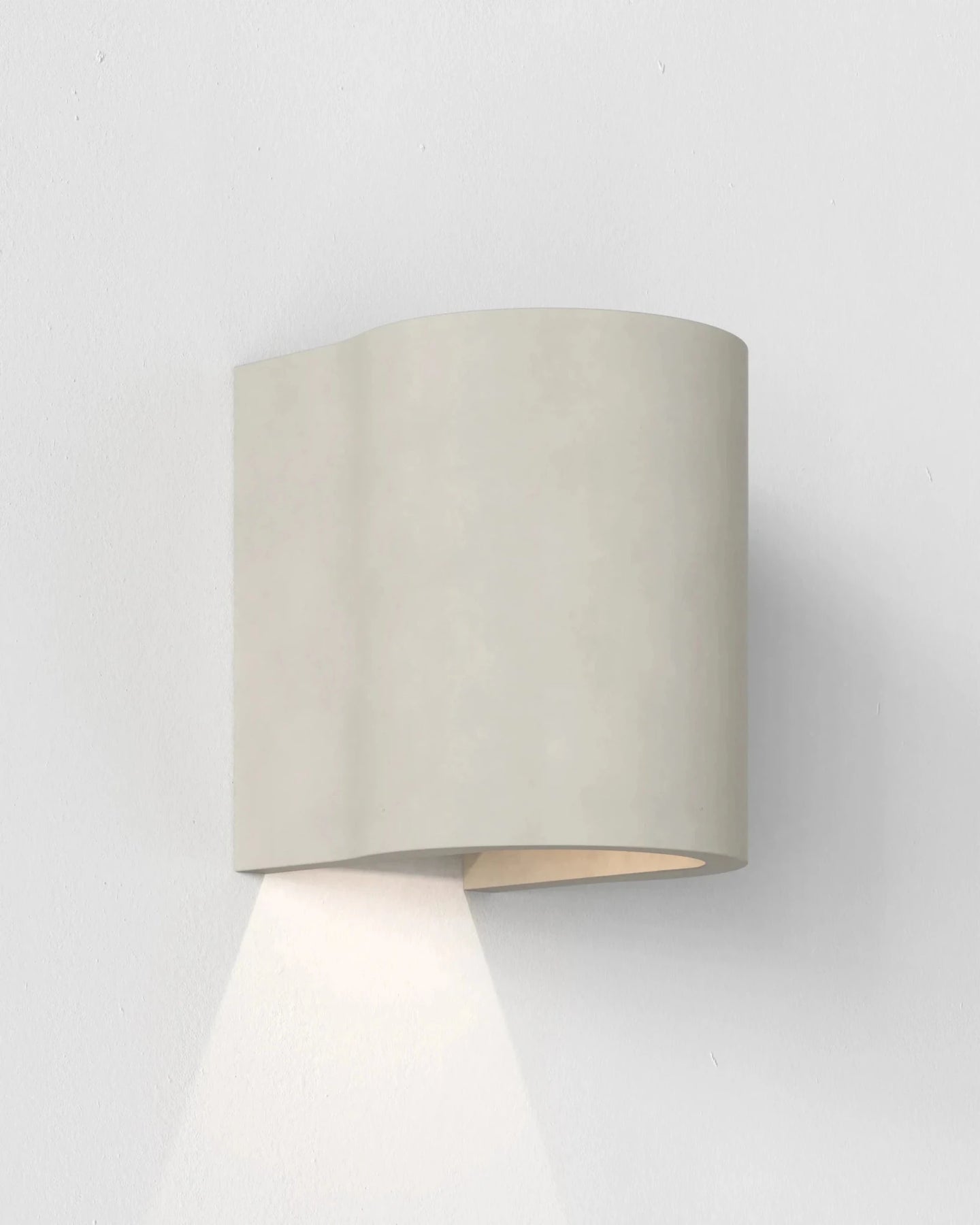 This contemporary outdoor wall light showcases a minimal curved form crafted from solid concrete, offering both strength and refined simplicity. Each piece carries its own subtle variations in texture and tone, celebrating the natural character of the casting process.