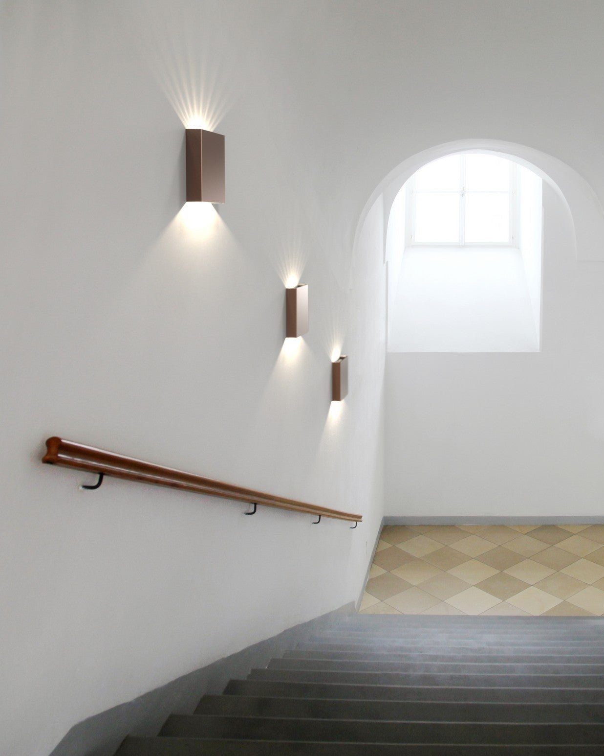 Staircase with wooden handrails and wall lights in a well-lit hallway.