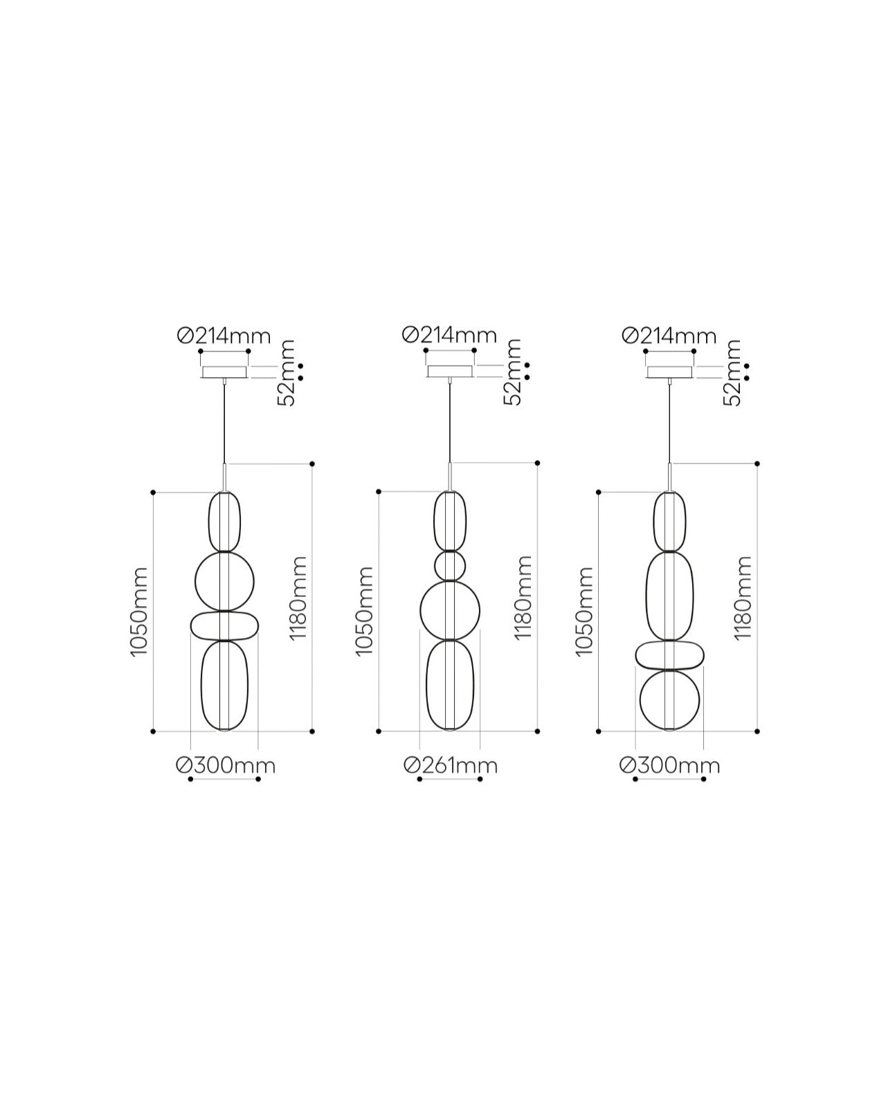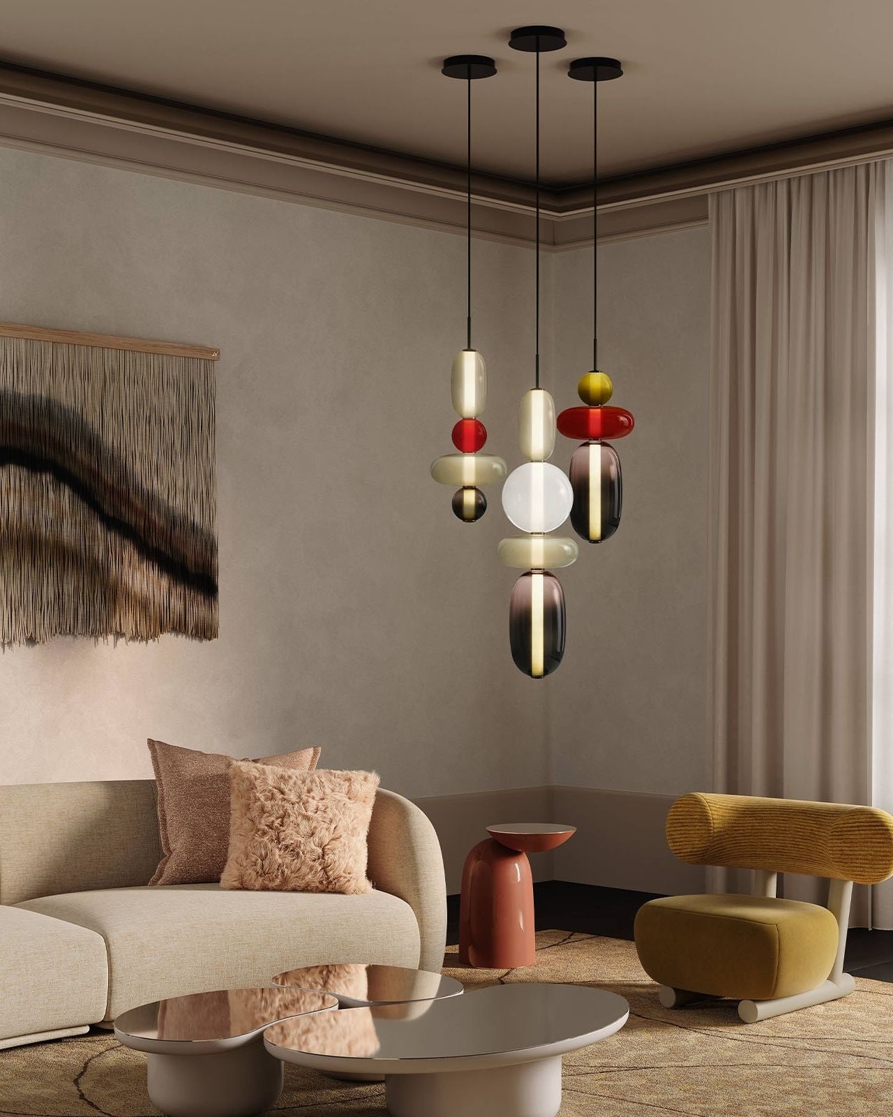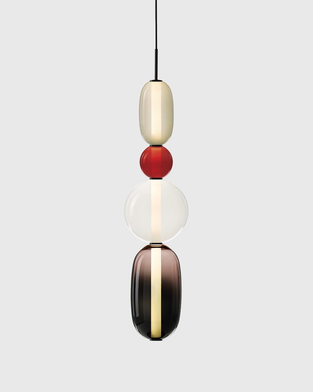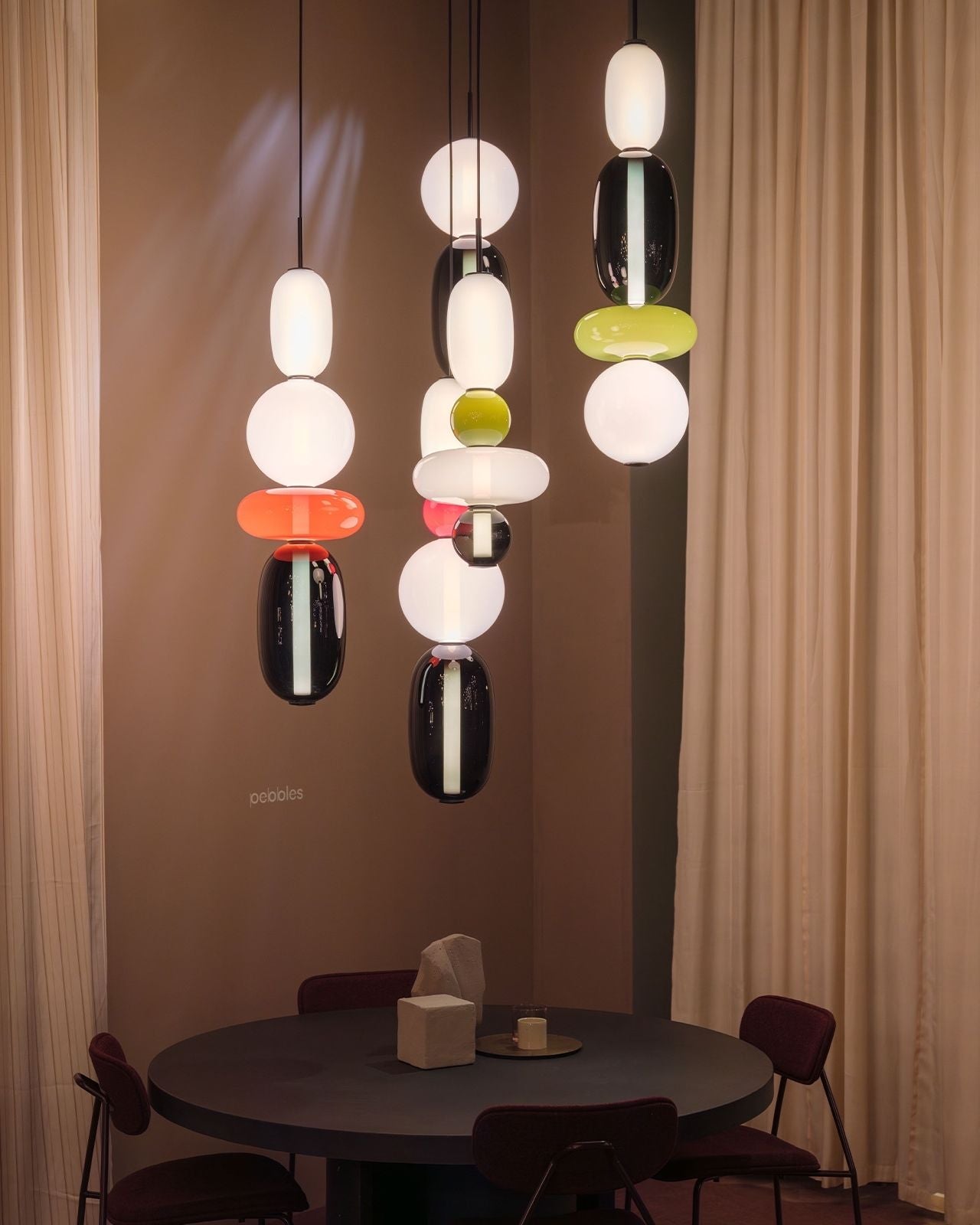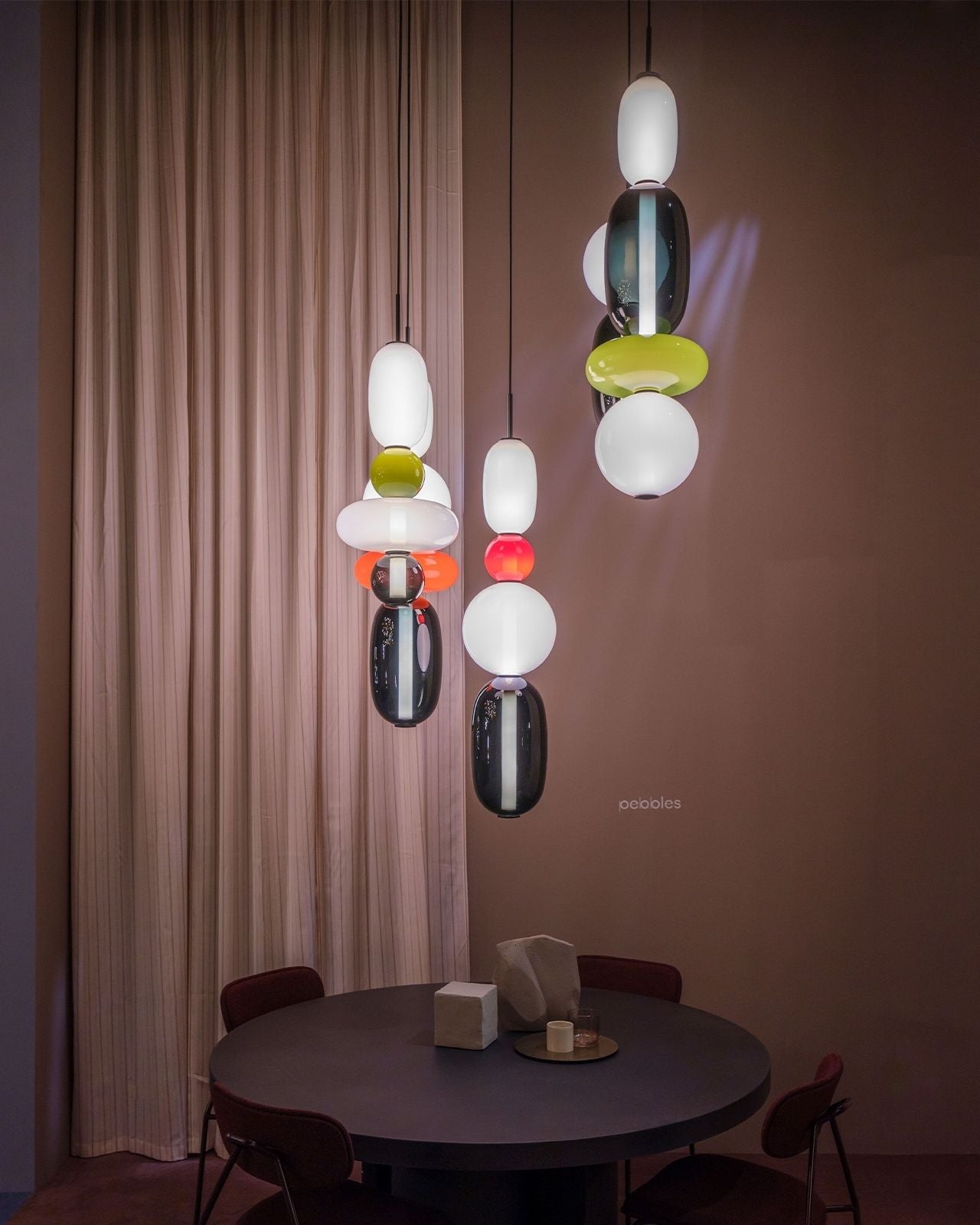 The Pebbles Large Pendant Light was crafted with inspiration taken from the vibrant hues and varied shapes of pebbles found on a sun-drenched beach. Each hand-blown glass element is connected to an interior light source and hangs like a string of colourful beads. One canopy is included, and alternate canopy options are also available upon request. For additional information, please contact our customer support. Choose from 9 different colourful configurations and hang with the Small Pebbles pendant for a feature effect.