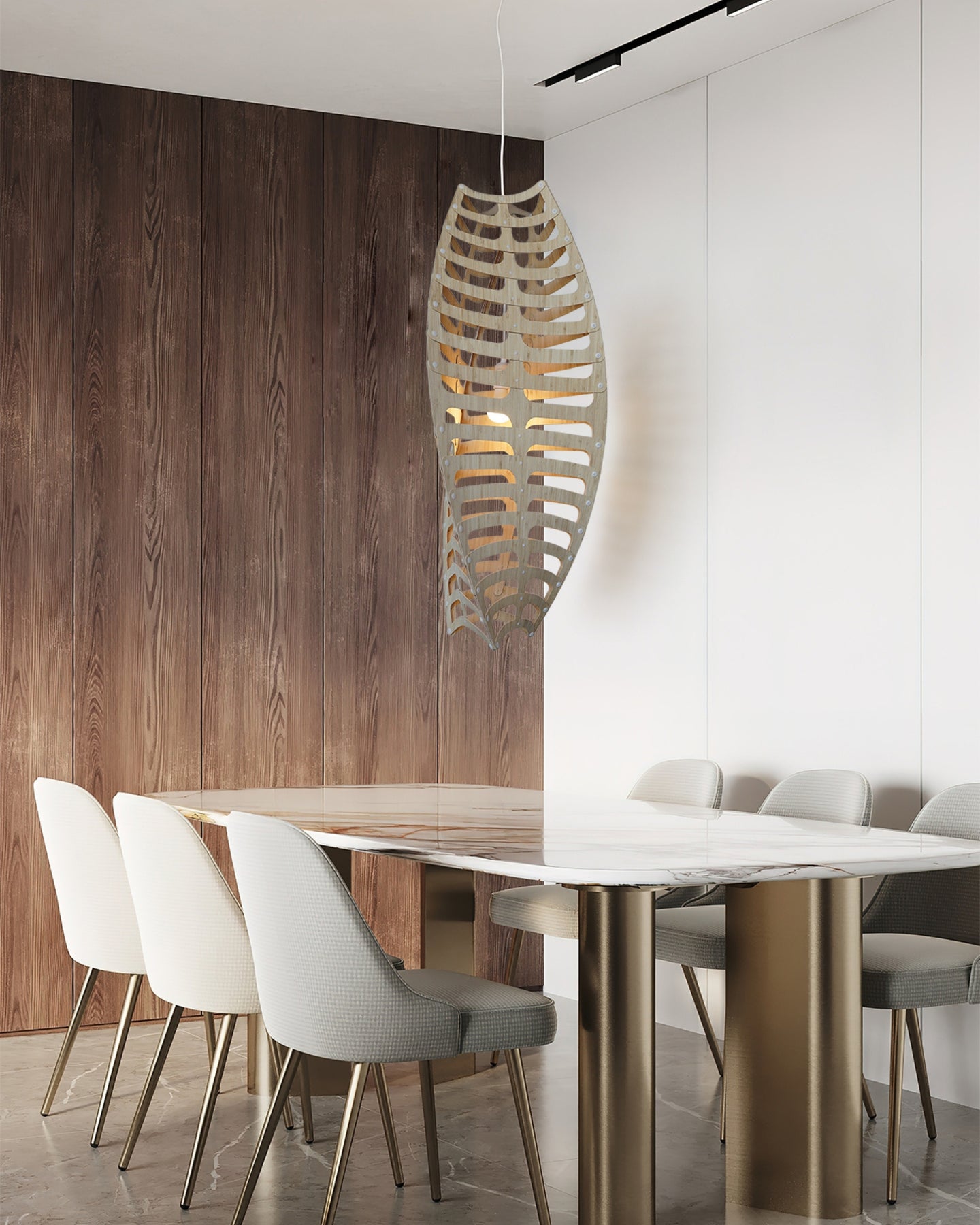Crafted from high-quality materials, the Toru pendant is built to last and boasts intricate patterns inspired by Triceratium diatoms. With its three sides, the unique fixture plays with light and shadow to artfully illuminate a space, making it ideal for a dining room, lounge, foyer or bedroom. Add a touch of nature to your space with the natural beauty of Toru.