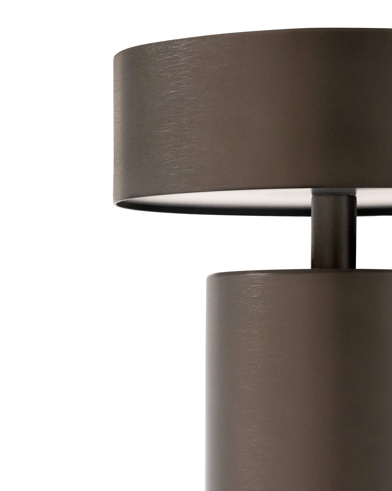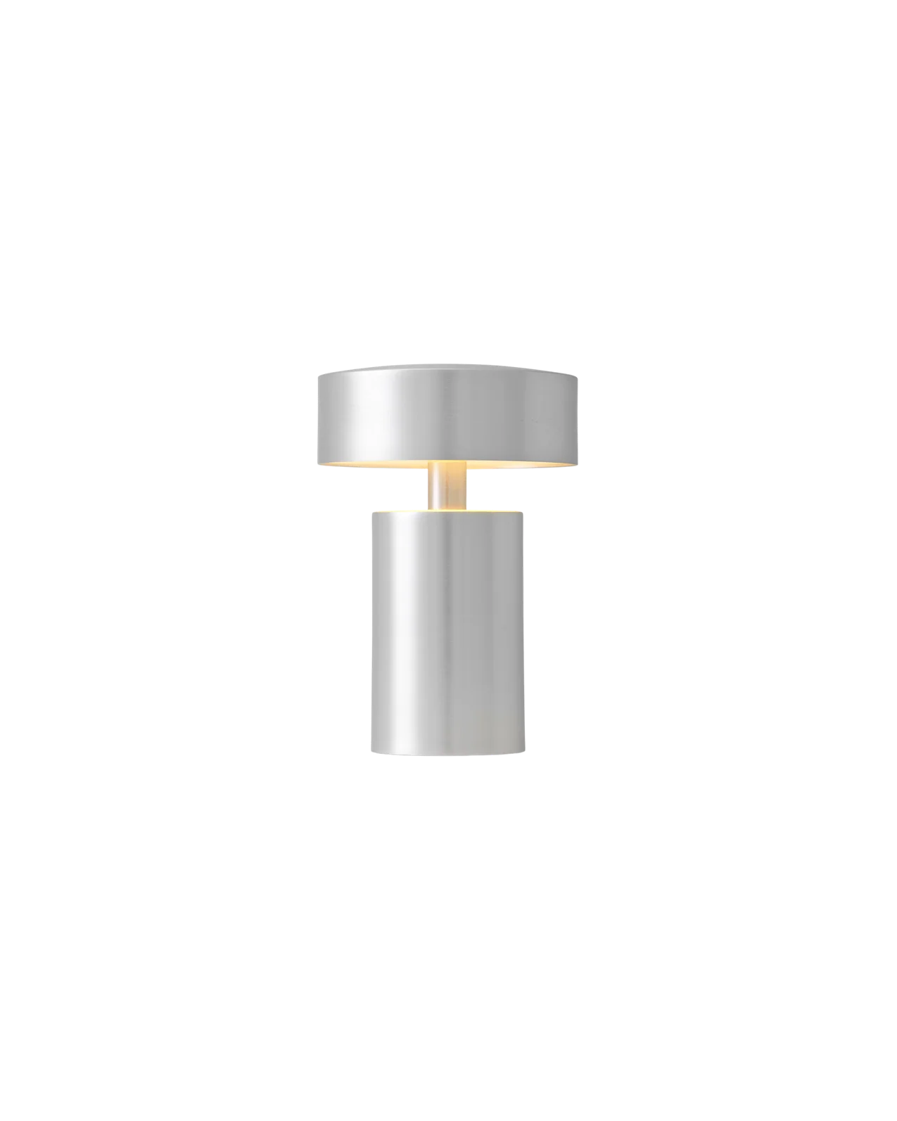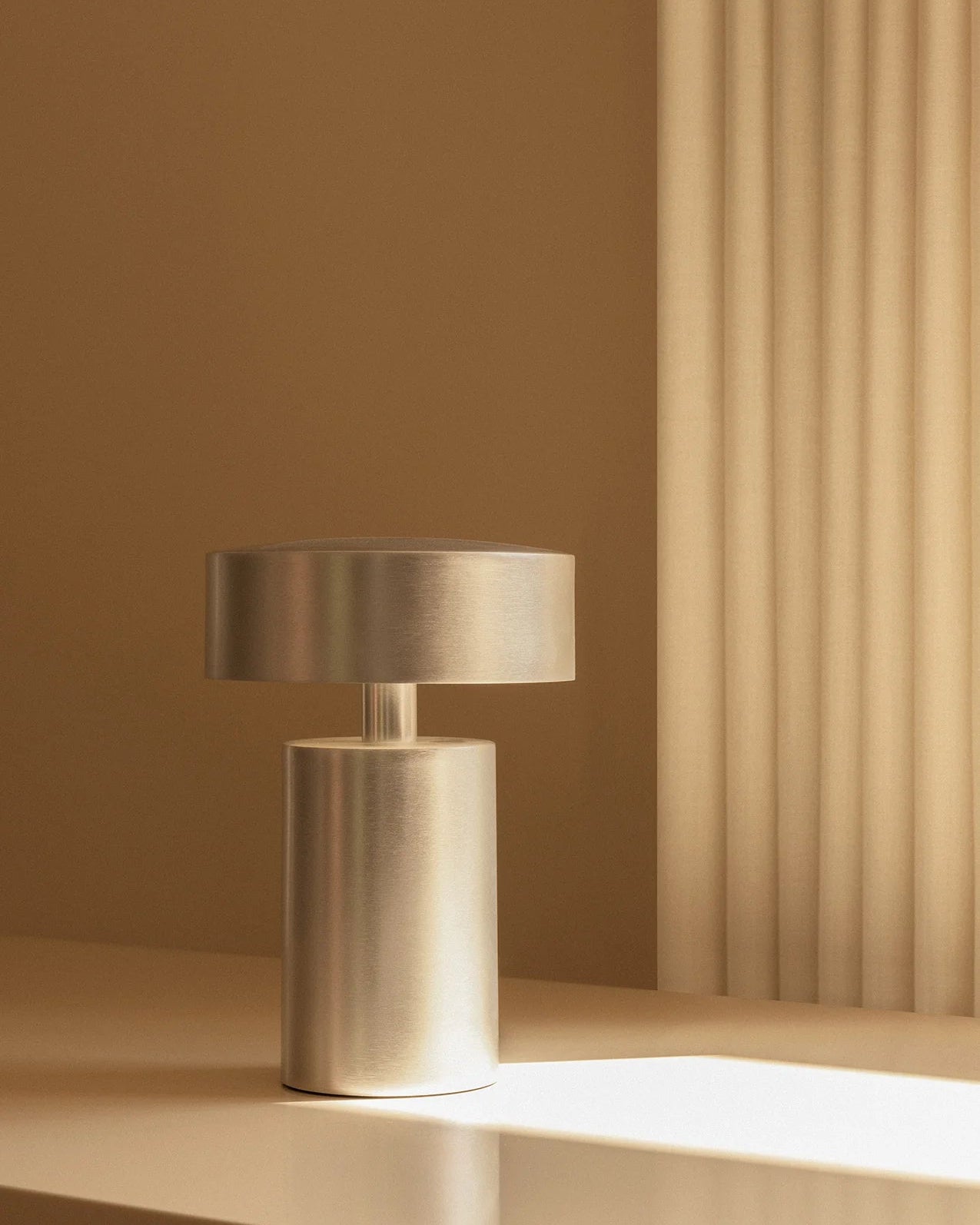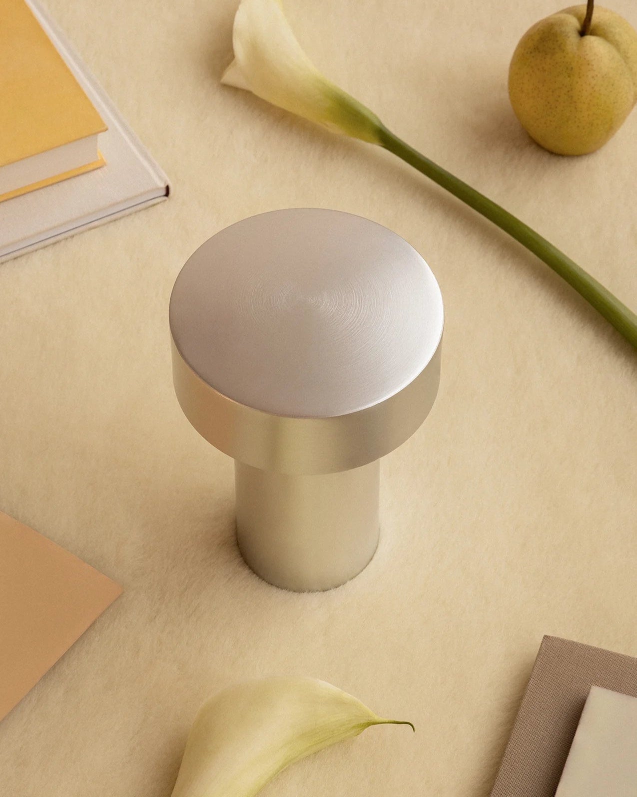 This table lamp is an ideal addition to any home, with its bronzed brass or brushed aluminum finish, lightweight design, and durable construction. It is dimmable, battery-powered, and has an IP44 rating, which means it can withstand rain, making it perfect for outdoor spaces like patios or terraces, as well as indoor spaces such as bedrooms, study rooms, or living rooms. Made from anodized aluminum, it has a modern and striking mushroom shape reminiscent of bollards used to secure vessels to a jetty.
