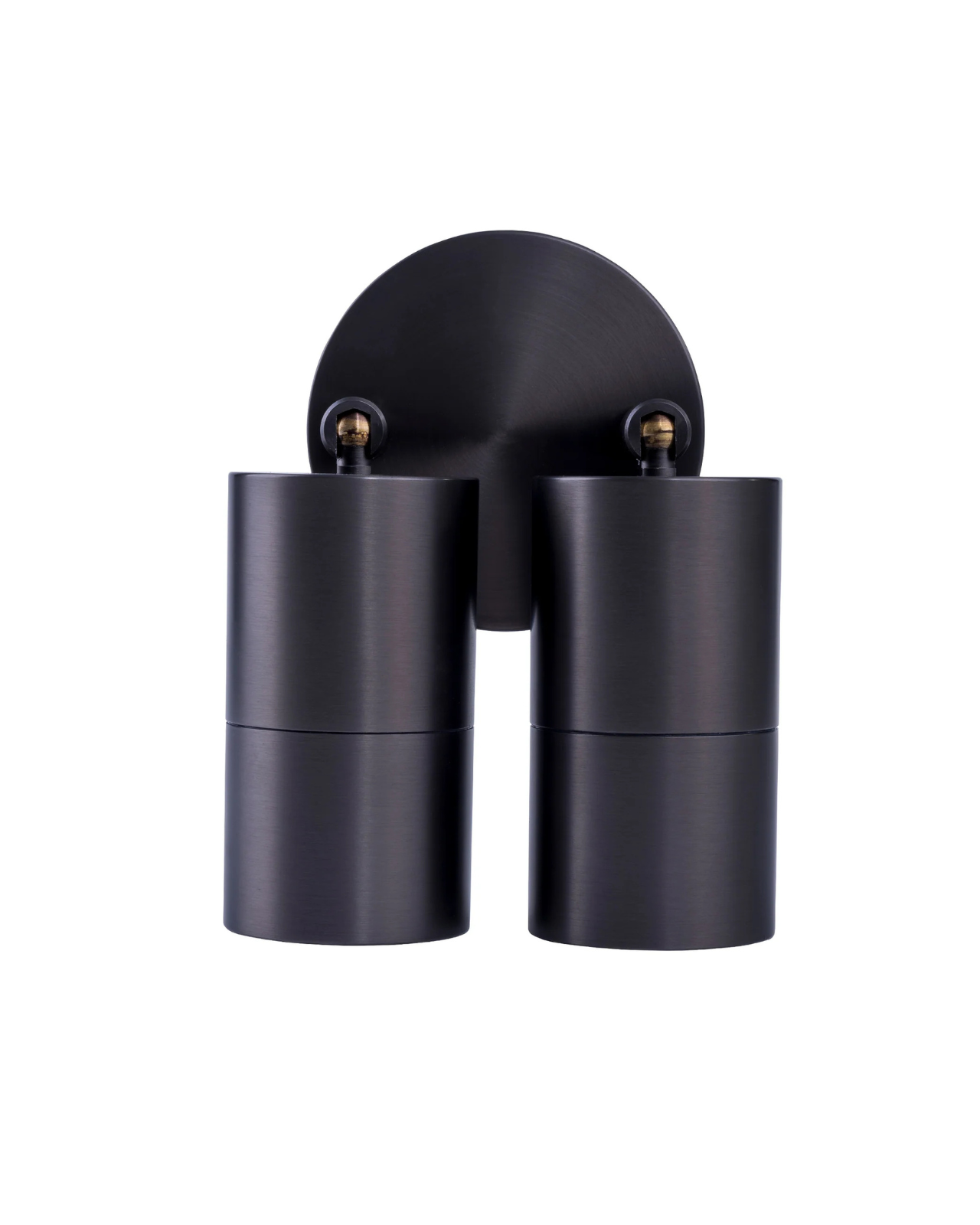 This adjustable double-head exterior spotlight is designed for durability and performance, with an IP65 rating to withstand harsh outdoor conditions. Its sleek profile integrates effortlessly into a variety of exterior settings, combining functionality with understated style. Crafted from solid brass with a graphite finish, the fixture exudes quality and longevity. The 9-in-1 model offers dimmable functionality, allowing light levels to be tailored to suit any outdoor ambience.