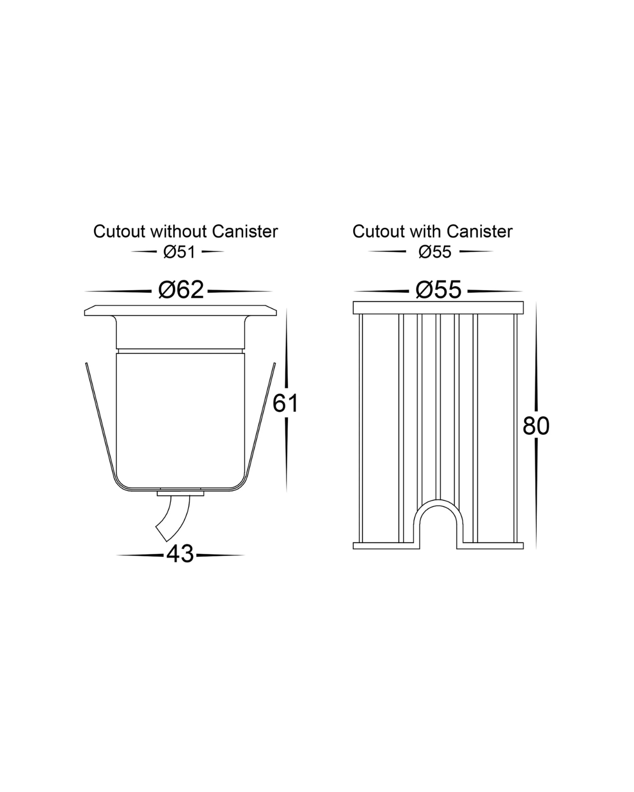 | Cut-out (without canister) | Small | 38mm Large | 51mm |