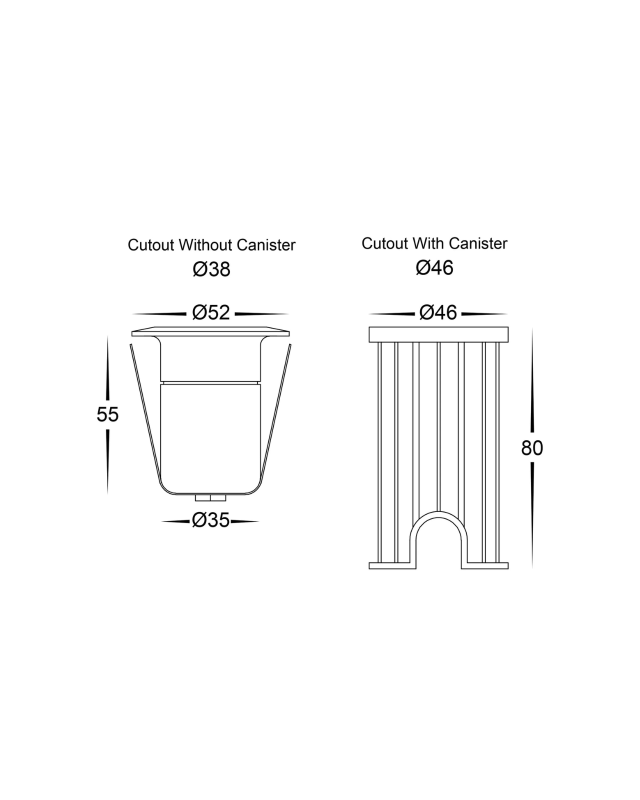 | Cut-out (with canister) | Small | 46mm Large | 55mm |