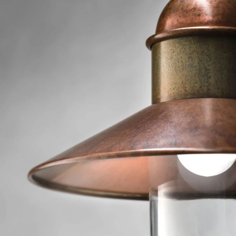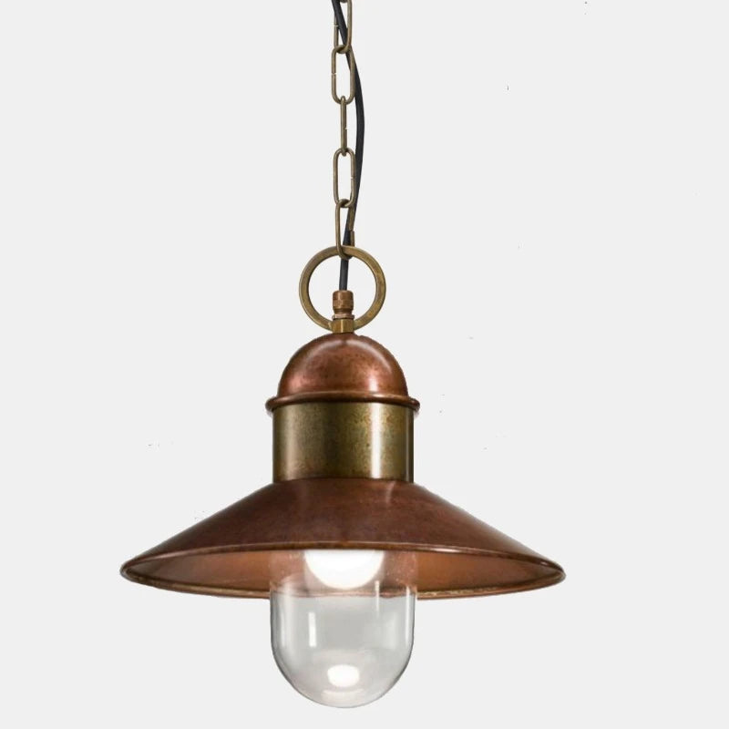 This classic design evokes a sense of industrialism through the elements of raw copper and brass, offering a pre-aged masculine feel to any minimal or modern space. Chain detailing suspend this pendant, perfect to sit above a kitchen bench or hallway.