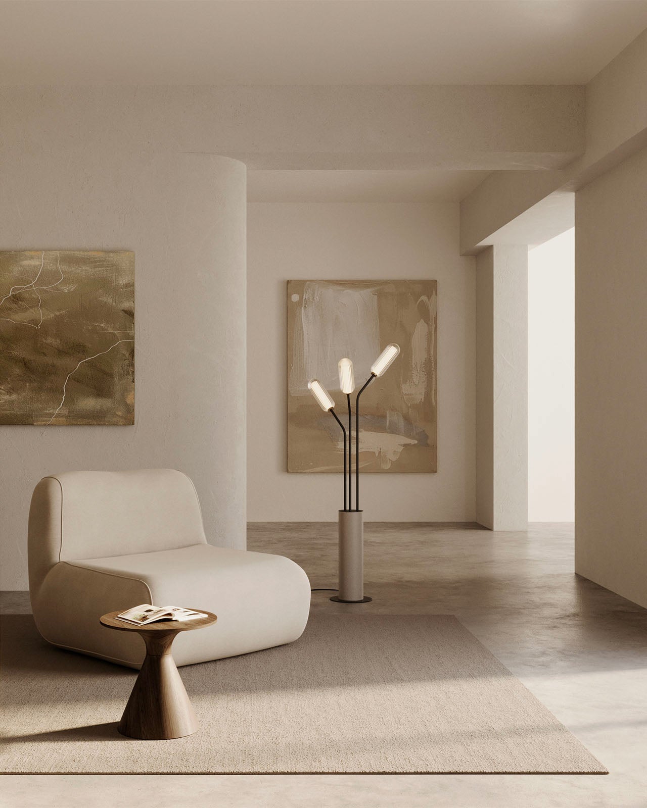 The Leather & Striped Glass Floor Lamp is a contemporary floor lamp with a sculptural, botanical-inspired design. It features a cylindrical base of leather-wrapped steel from which three slender, black stems rise upward at varying angles. Each stem bends slightly and is topped with a tubular, vertically-ribbed glass bulb, giving the appearance of delicate buds on a plant. The overall form is elegant and understated, blending minimalist structure with organic movement, making it a striking piece for modern interiors, particularly in reading corners, lounges, or as a statement feature in minimalist spaces.