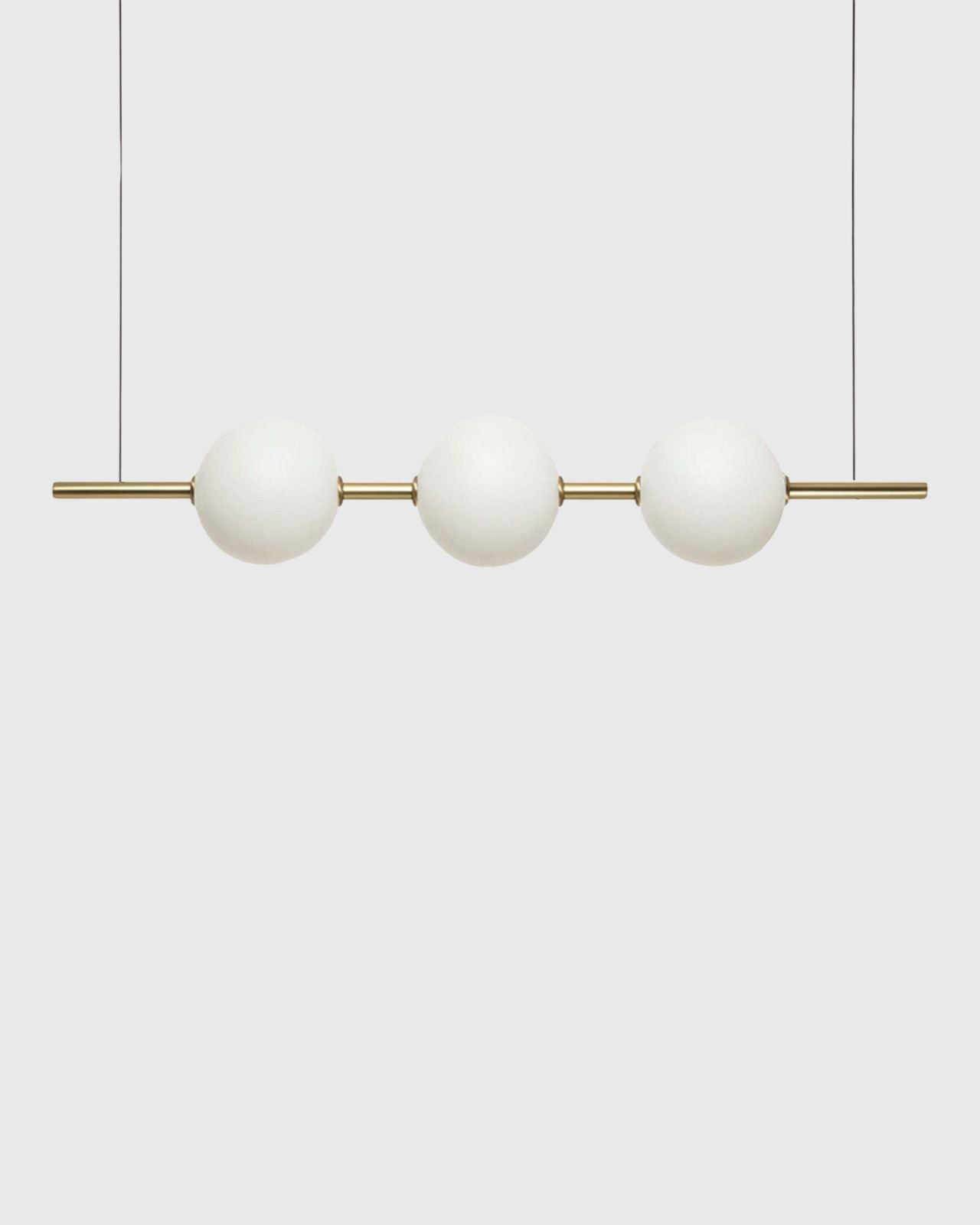 A suggestive fusion of glass and brass, this beautifully created pendant suits contemporary, modern interiors. Beaming with intense light given off by the dimmable LED light source. The balanced geometry gives a sense of stability lightened by the suspended light spheres.