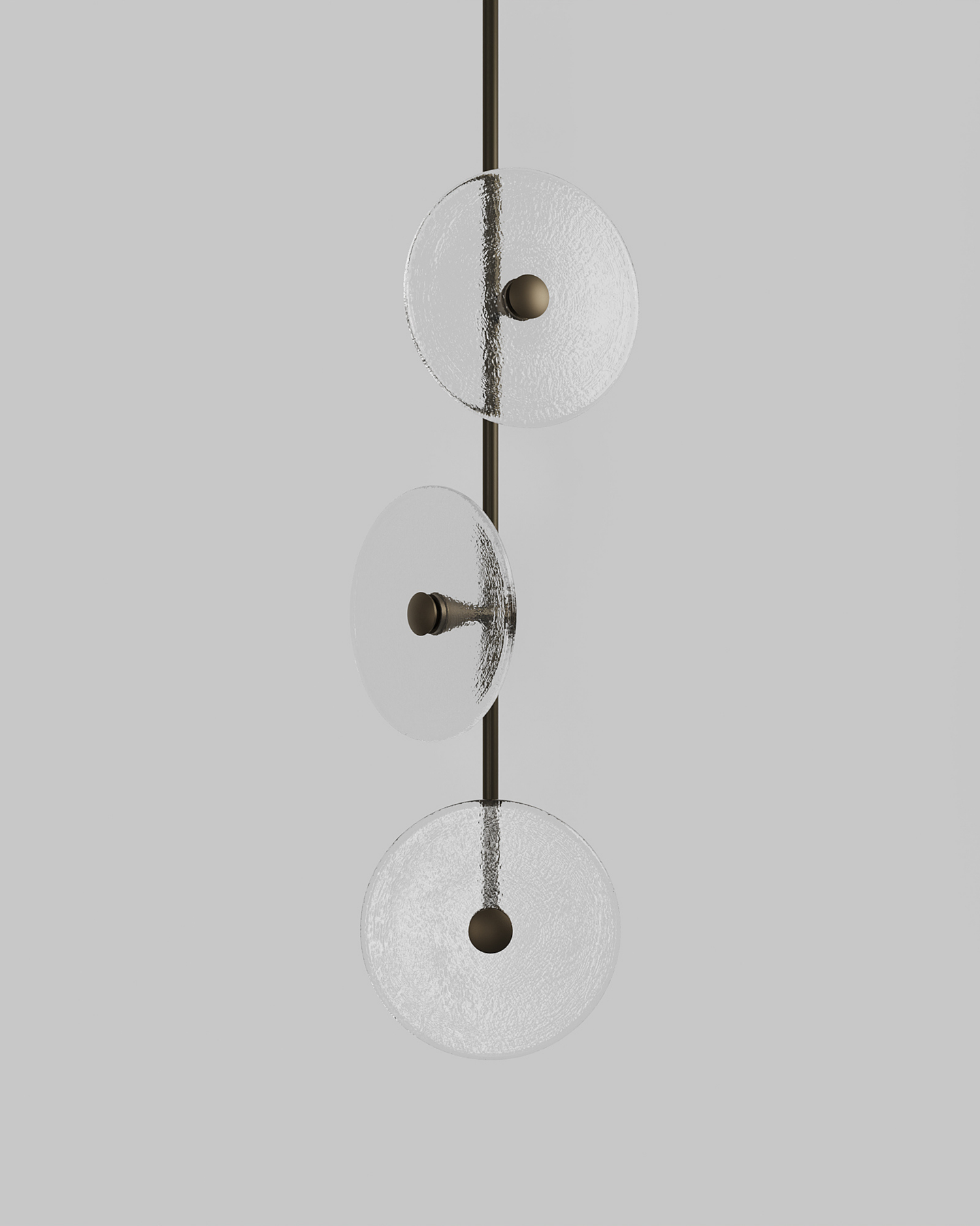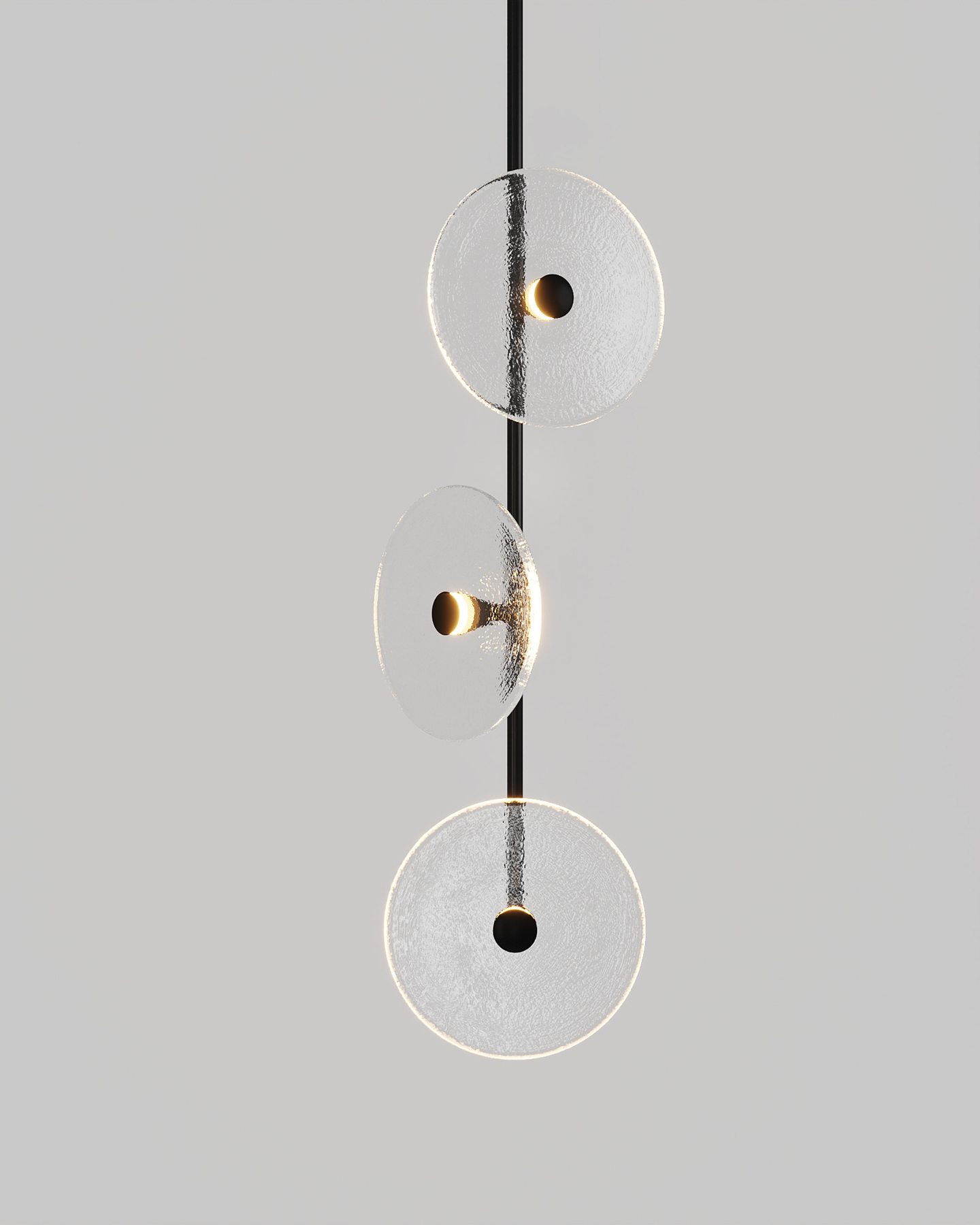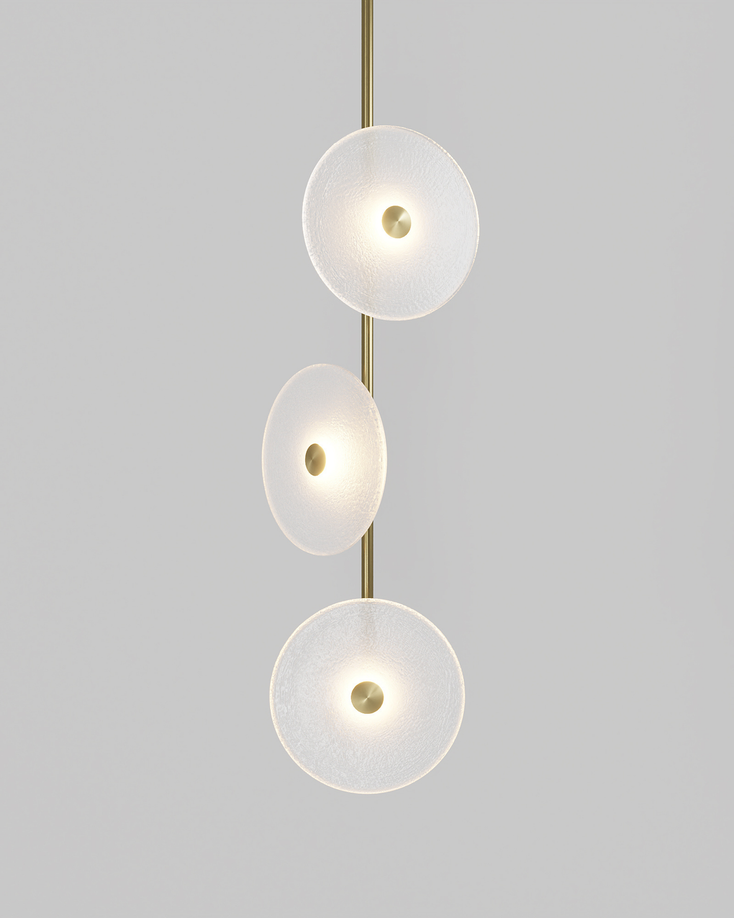 Custom trio pendant light with organic glass discs in warm tones, displayed on neutral grey background.