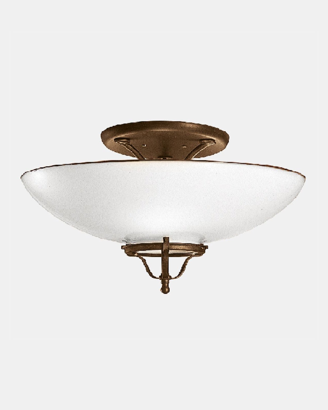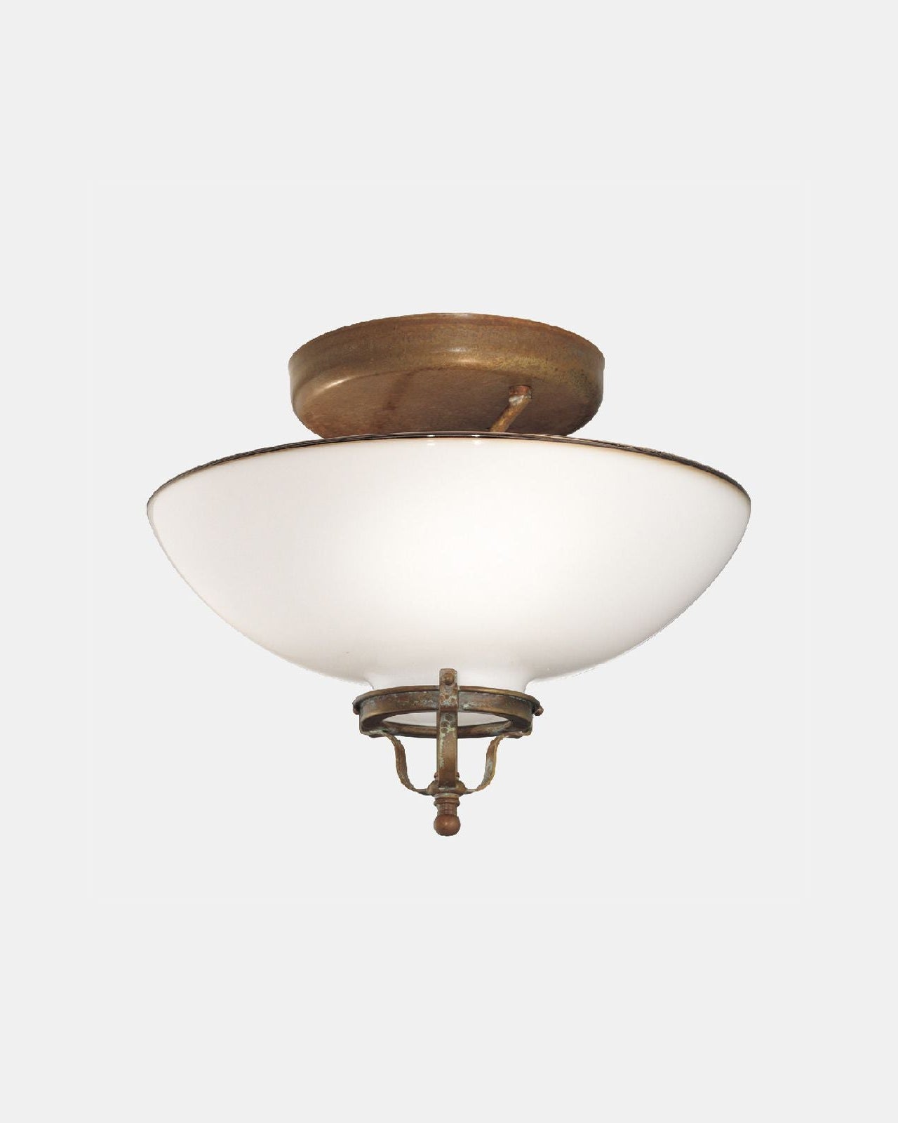 Handmade using traditional Murano glassblowing methods, this Italian Country Ceiling Light embodies timeless craftsmanship and rustic charm. The antique brass structure, accented with a warm burnt brown edge, enhances its vintage appeal. Available in two unique shapes and sizes, this fixture brings both sophistication and flexibility to farmhouse-inspired interiors.