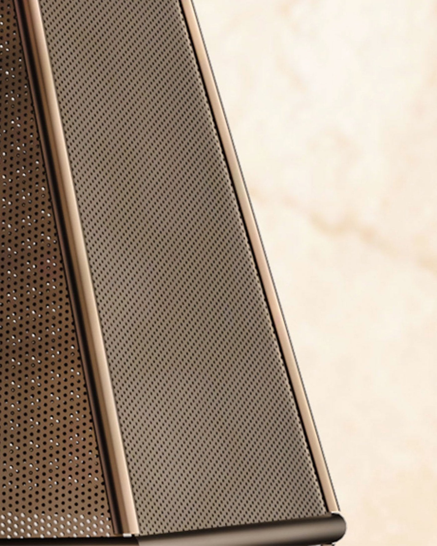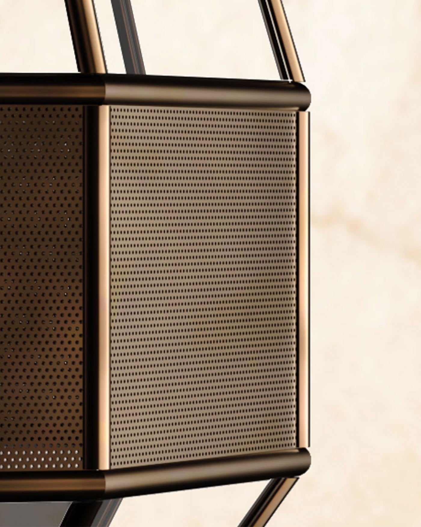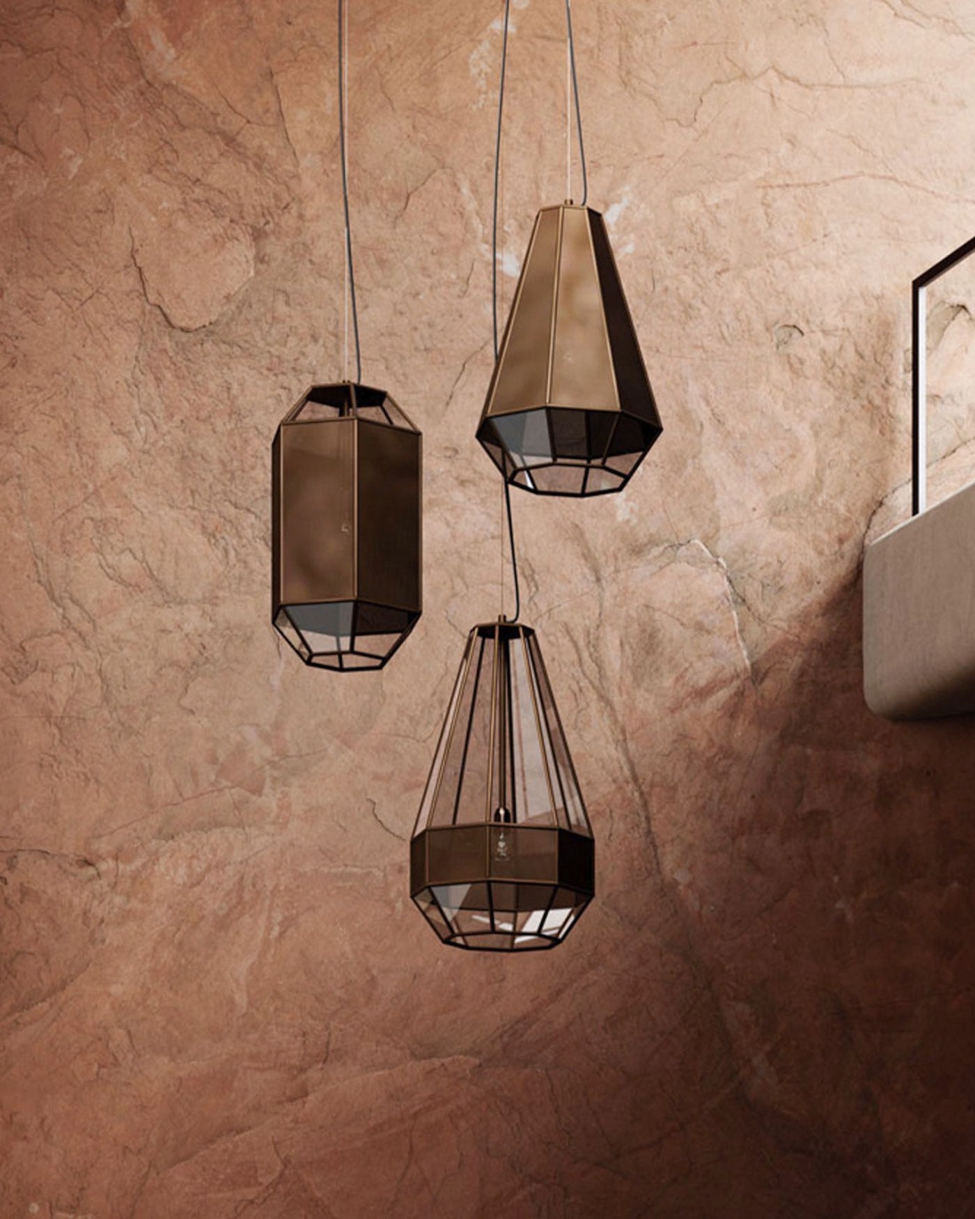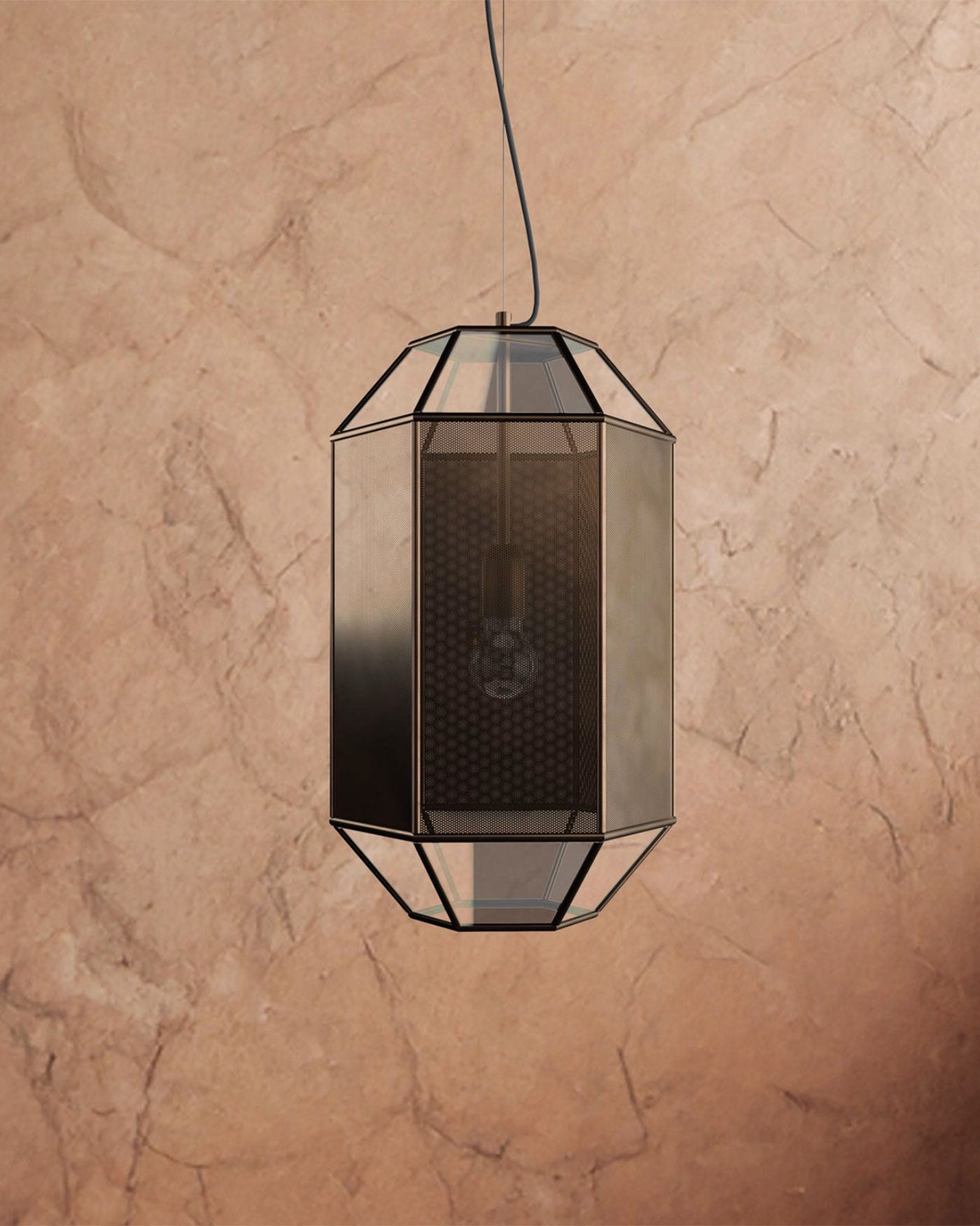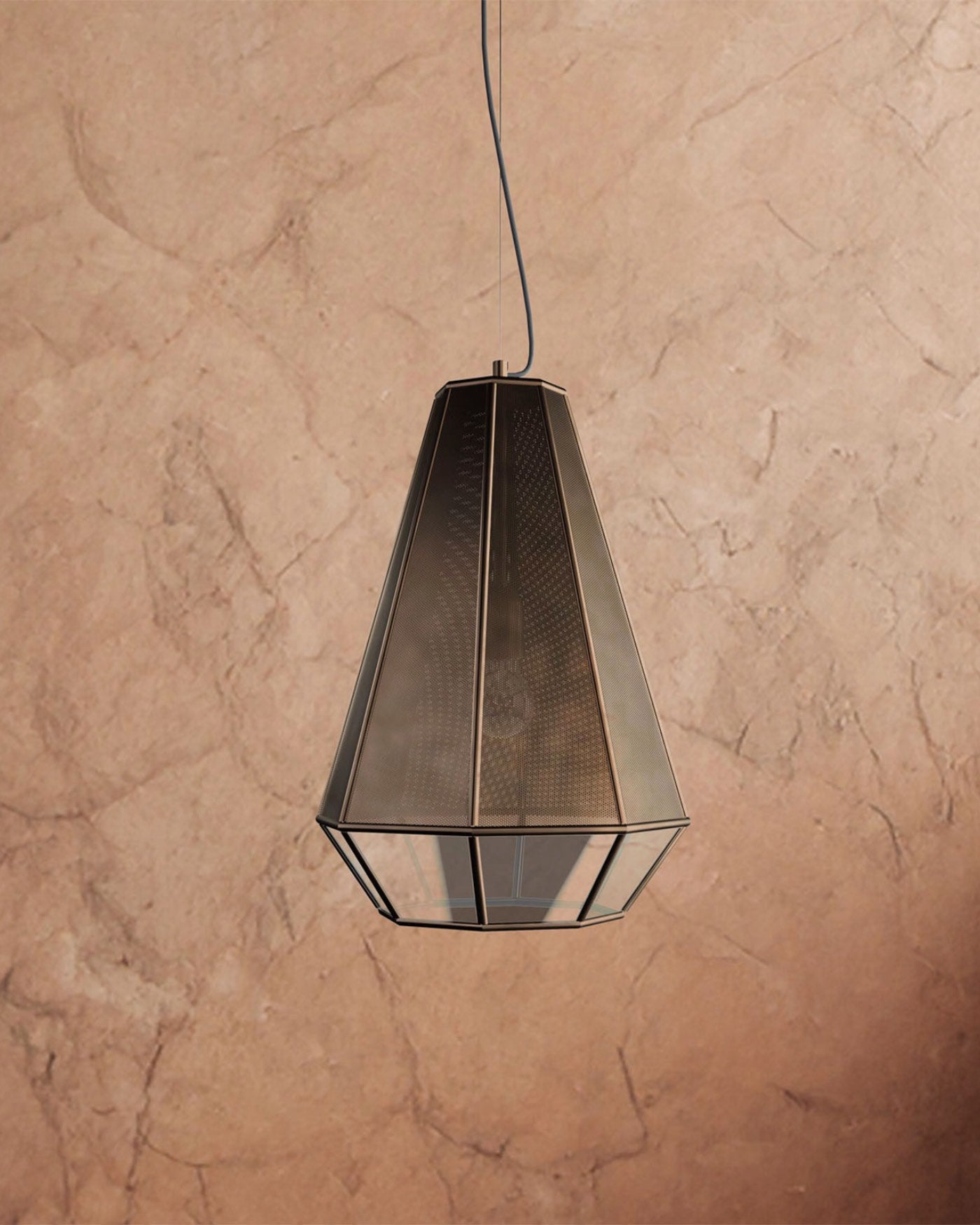 Designed in collaboration with Studio Zazi, this pendant is crafted from micro-perforated brass and transparent glass and will stand out in interiors. Available in three geometrical shapes, this contemporary and elegant fixture reinterprets tradition with a modern flair. Suitable for modern or rustic interiors thanks to its simple lines and rustic materials, it will nicely illuminate bedrooms, living rooms, lounges or entrance halls spreading a unique pattern on the walls.