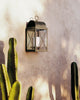 Aged brass lantern wall light displayed in a hacienda exterior near cactuses