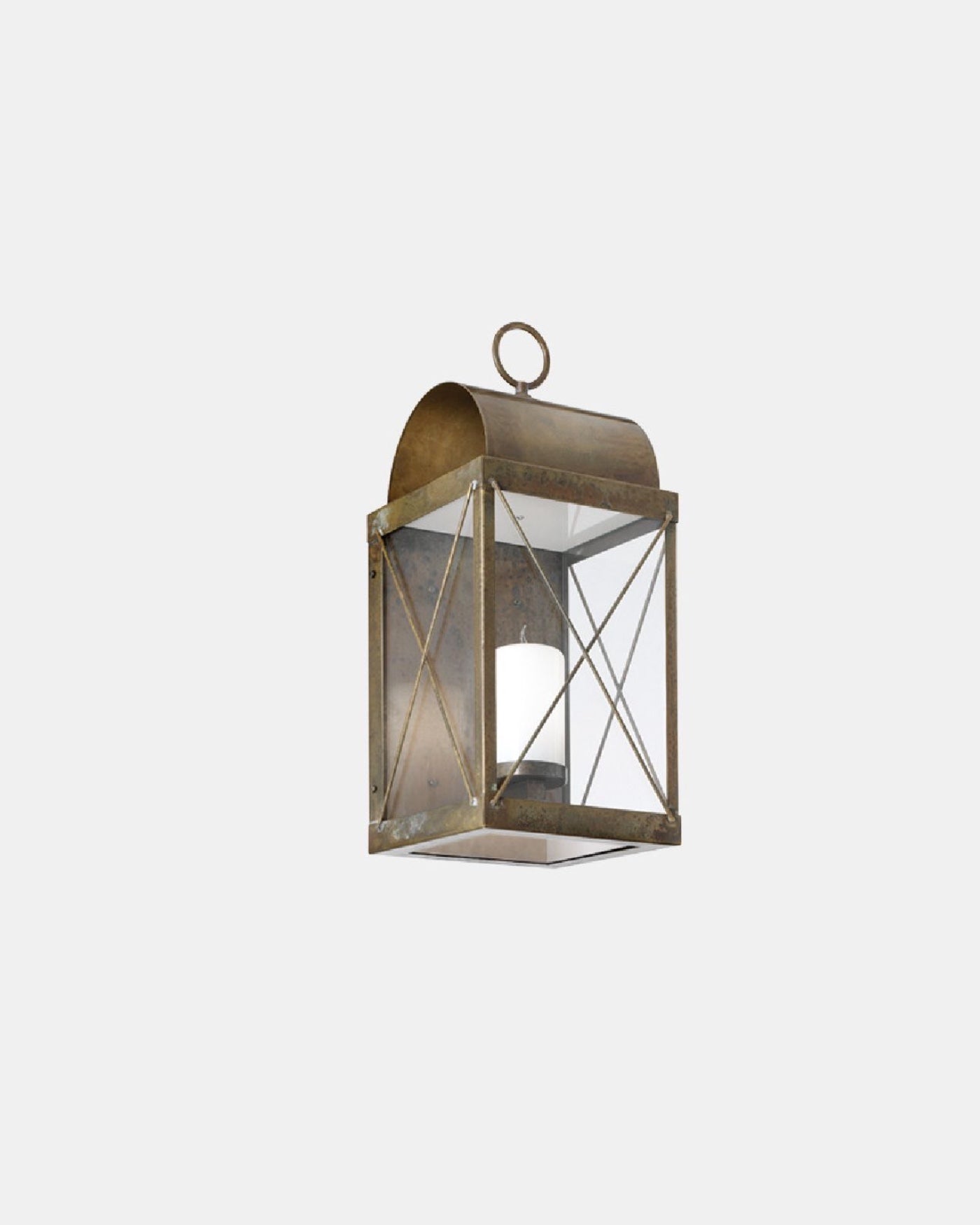 Aged Brass lantern holding a replica of a candle on an exterior grey wall