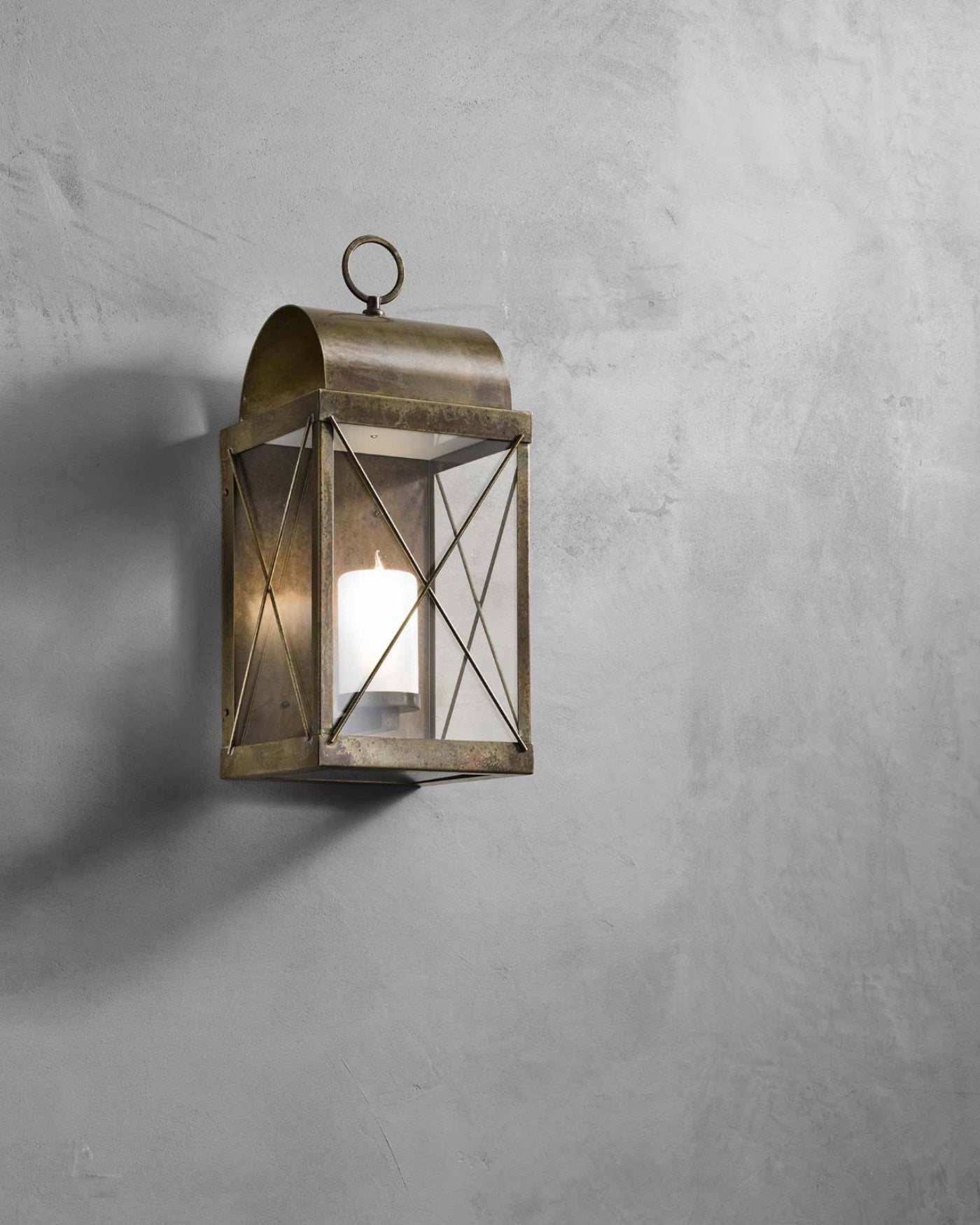 Drawing inspiration from traditional lanterns and oriental design, this handmade Italian wall light will add timeless style to your outdoor area. It features a frame of antique brass, complemented by luxurious Murano glass and a faux-candle lamp holder.