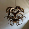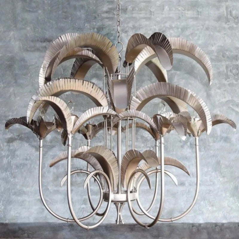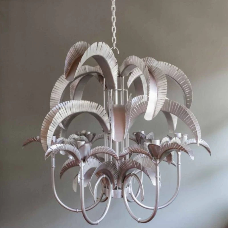 This sculptural chandelier combines luxury and coastal design. Crafted from steel and finished in a powder coating this fitting showcases detailed leaf blades and six lamp holders. Suspended from a one-meter chain suspension this chandelier fits perfectly into coastal and eclectic styled interiors. This fitting beautifully suits being installed above a dining table, large void entryways or large living areas. Available in two sizes and either Pewter or White. Designed in Australia and handmade in Indonesia each fitting is individually made and therefore each item is different and individual. Please note that it comes un-wired and needs to be both wired & installed by a qualified electrician.
