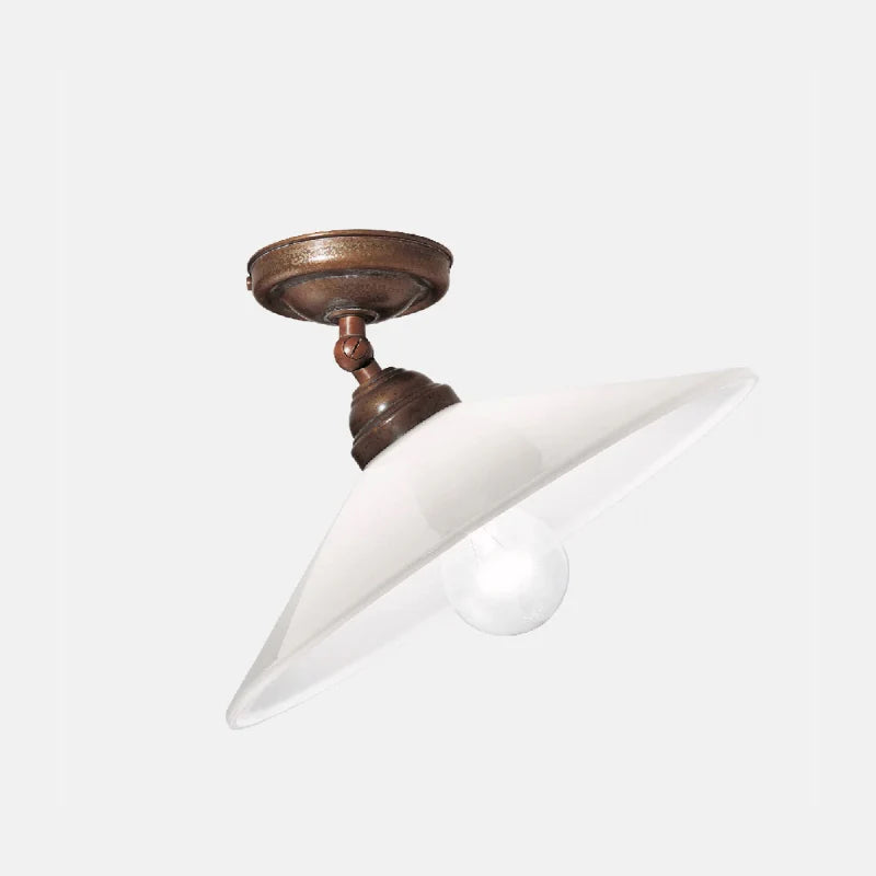 Mounted on a short arm, this stylish ceiling light is adjustable allowing to direct the light where it is needed most in living rooms, kitchens or entrance halls. Available in three different sizes, it revisits original materials from Italy with a modern twist. This fixture features a wide conical shade made from white glass and brass with an pre-aged finish, spreading a pleasant light around.