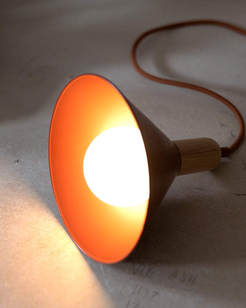A contemporary pendant proudly designed and crafted in Currumbin, Australia. Designed to suit modern interiors with a vibrant touch of colour. Its solid hardwood holder is available in assorted timber finishes and is paired perfectly with a solid brass shade in a powder-coated terracotta. finish. Paired with a 1.5-meter textile cord and matte opal glass E14.
