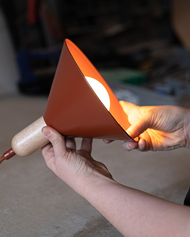 Hand holding a Sibling pendant with a wooden base and terracotta conical shade