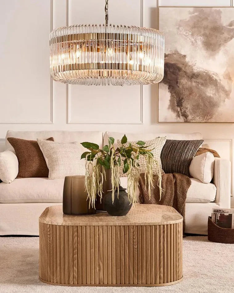 Modern living room with a chandelier, sofa, coffee table, Brass and Glass Loops Chandelier