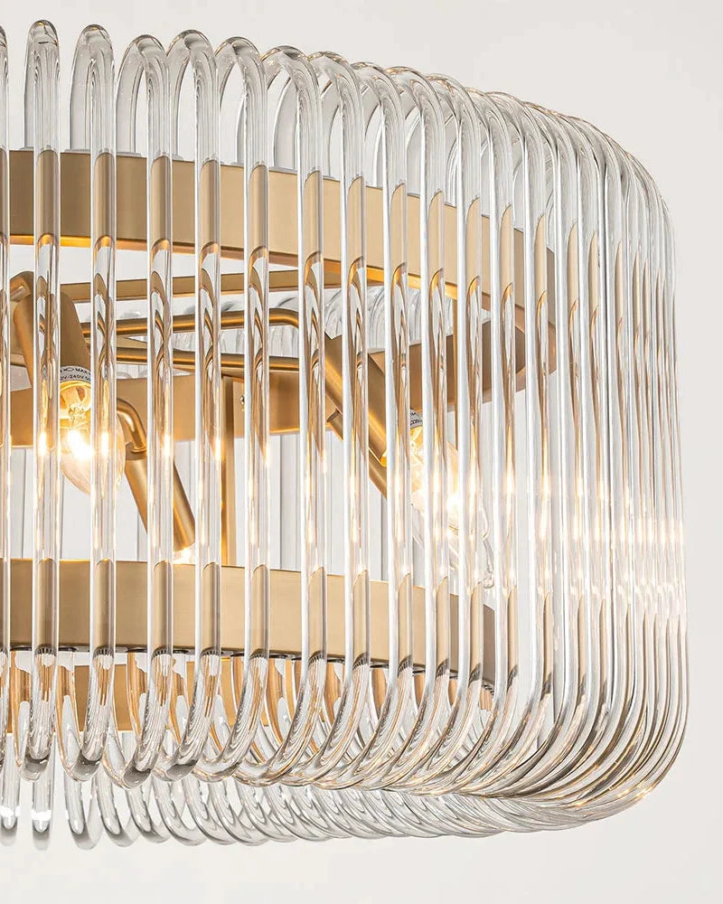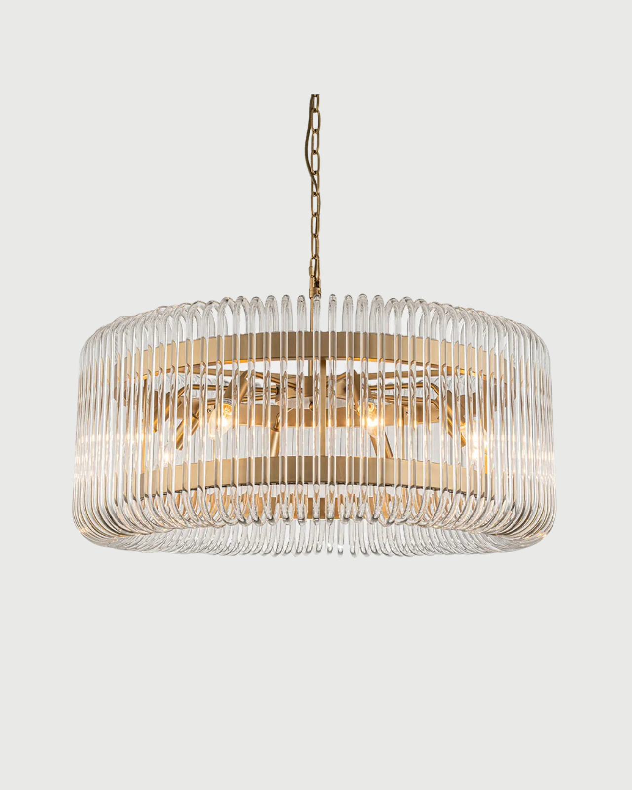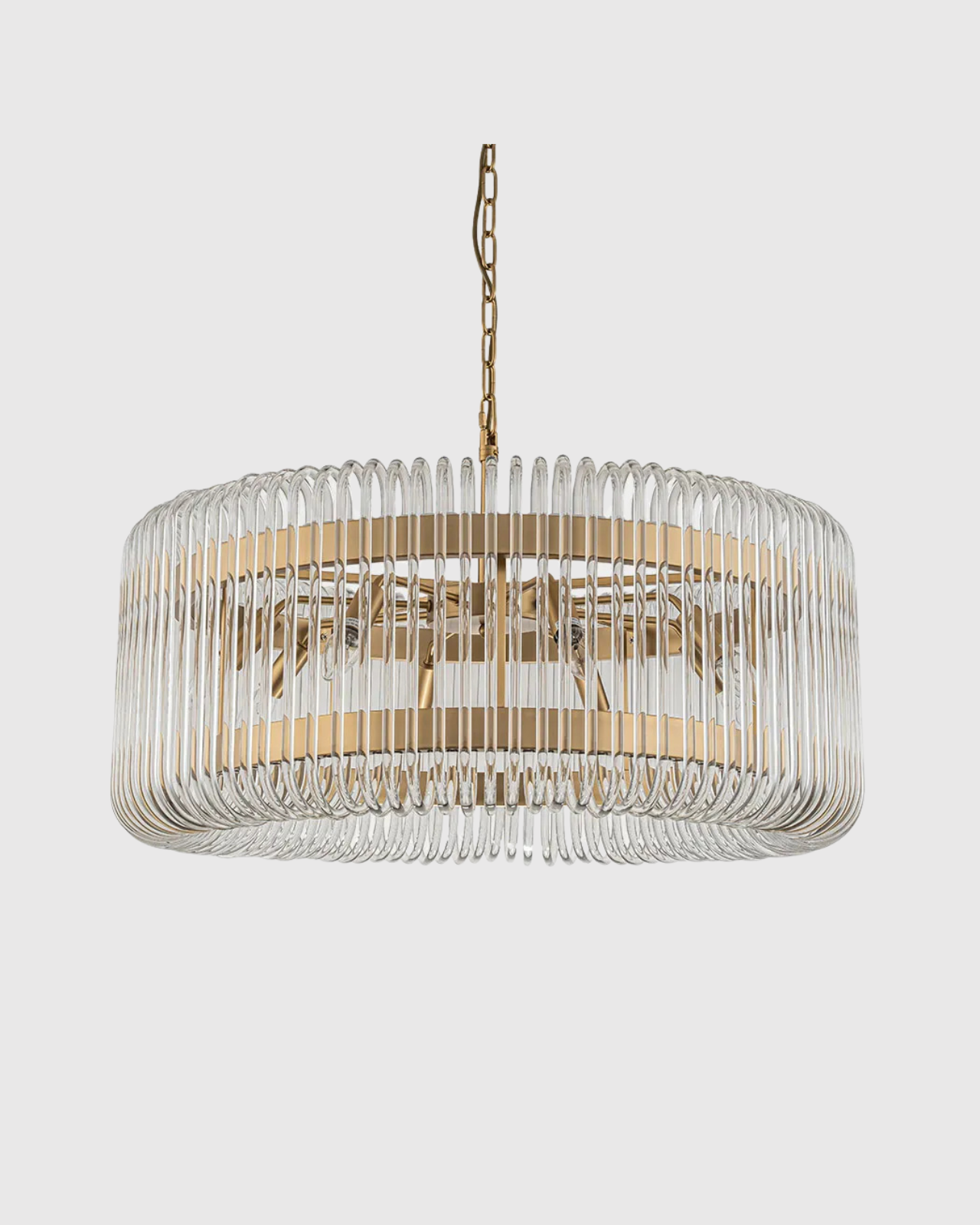 This exquisite chandelier adds an elegant and luxurious touch to interiors. Whether in a living room, dining table, or hotel lobby, the adjustable metal chain suspends the circular iron frame with a refined brass finish. Within the frame, clear glass loops bring intricate detail and allow an interplay of light and shadow, creating a captivating ambience.