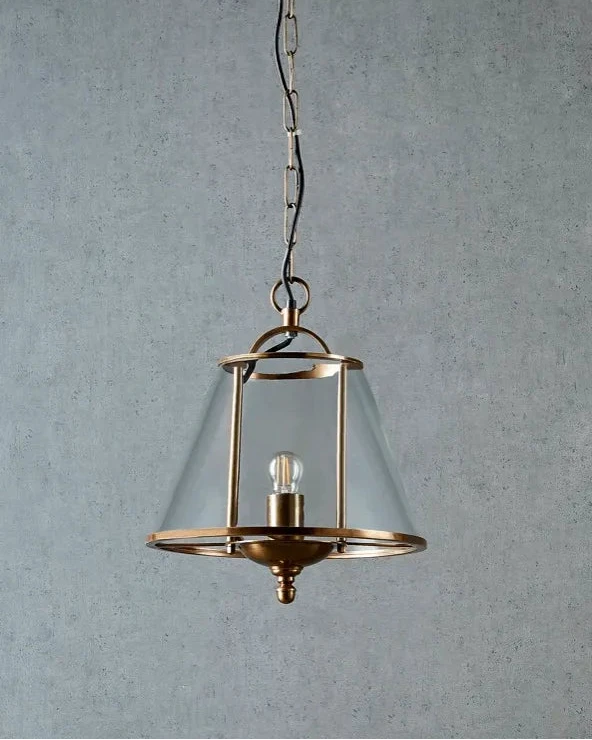 This pendant light features a sleek brass frame paired with a sophisticated glass shade, creating a harmonious blend of structure and transparency. The elegant design casts a warm, ambient glow while adding a refined, sculptural element to the space.