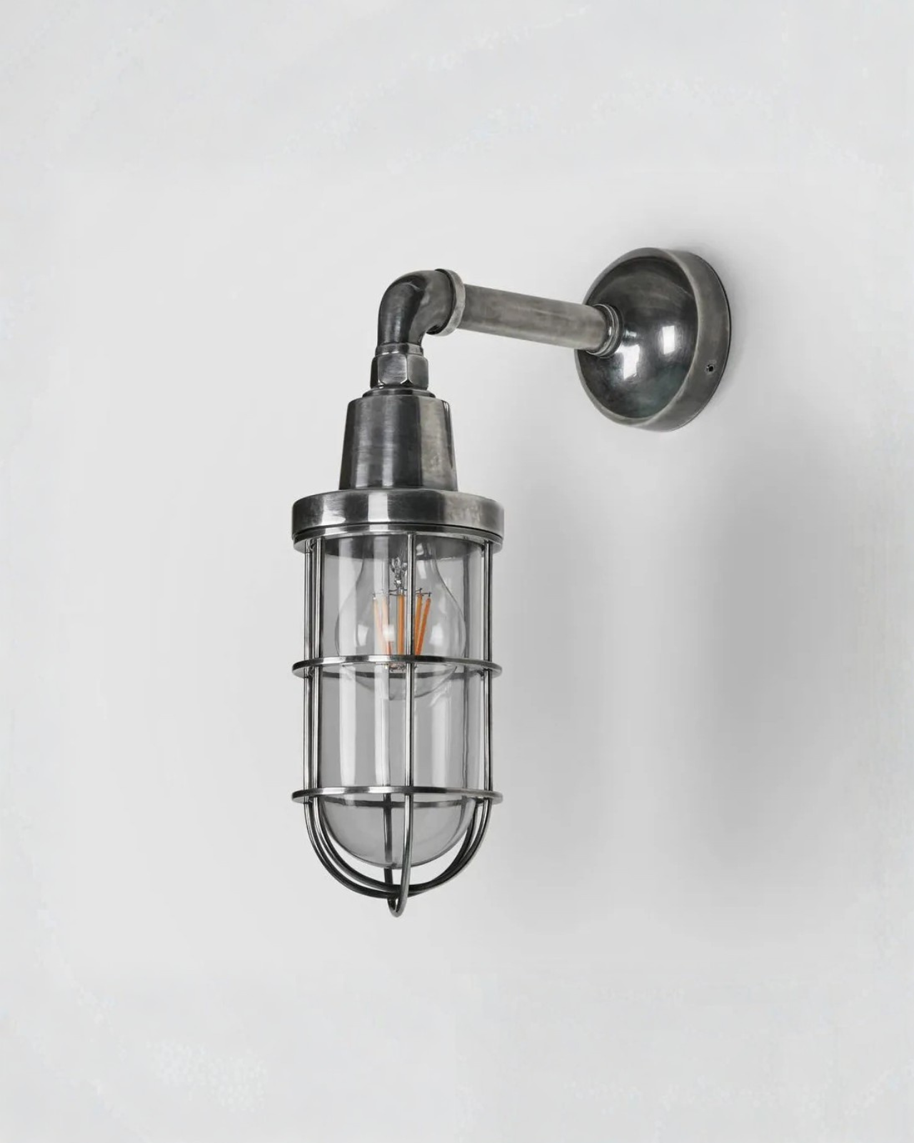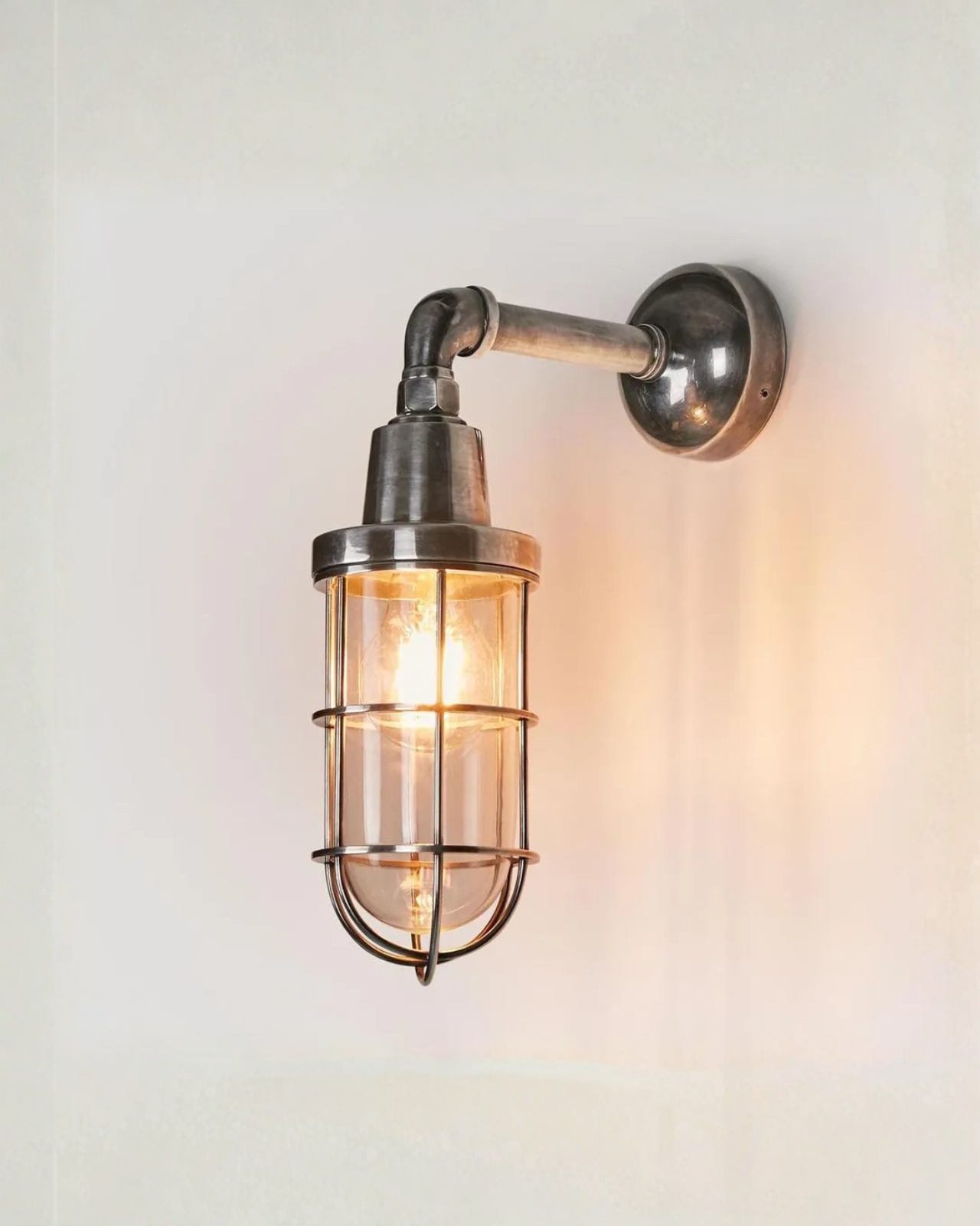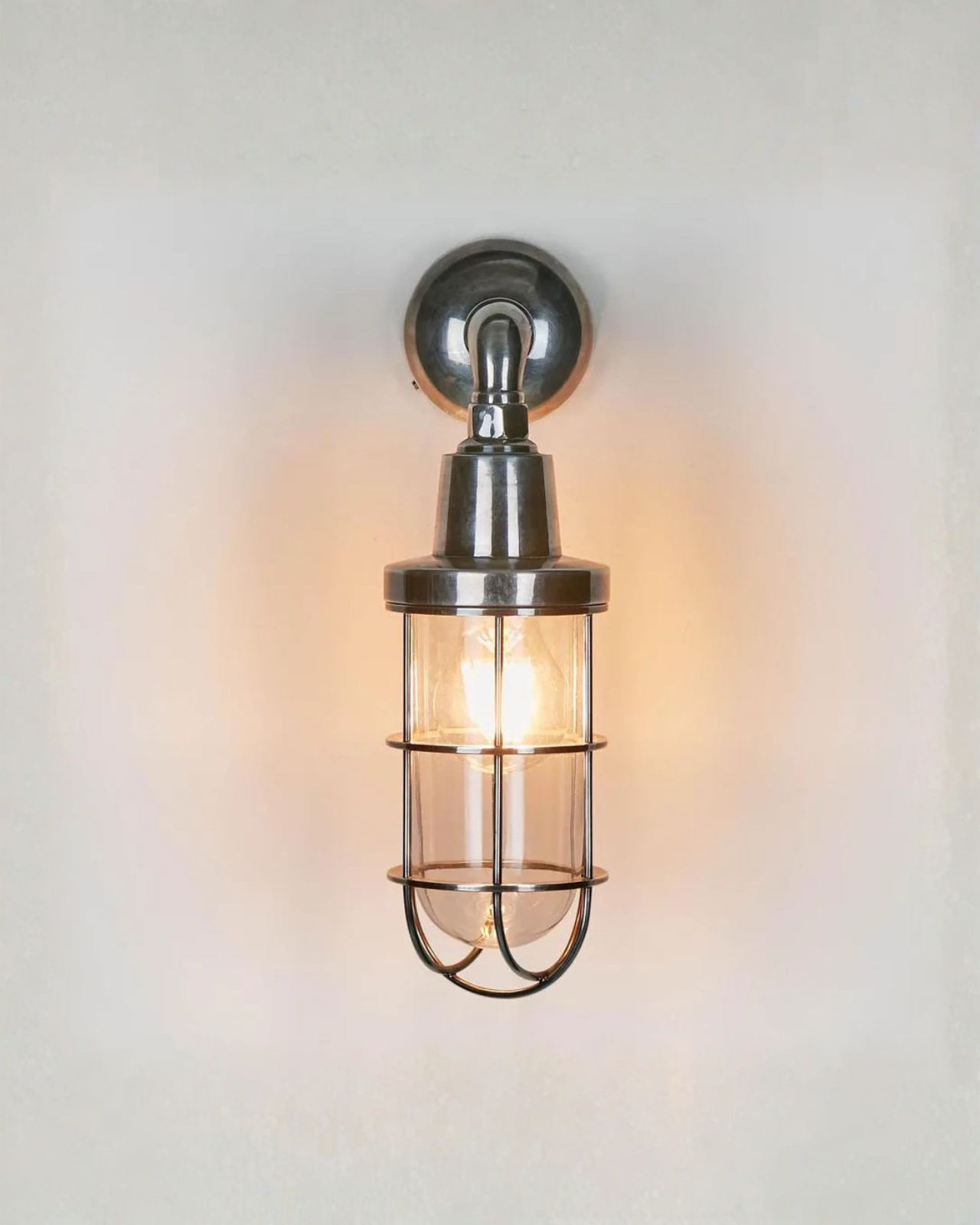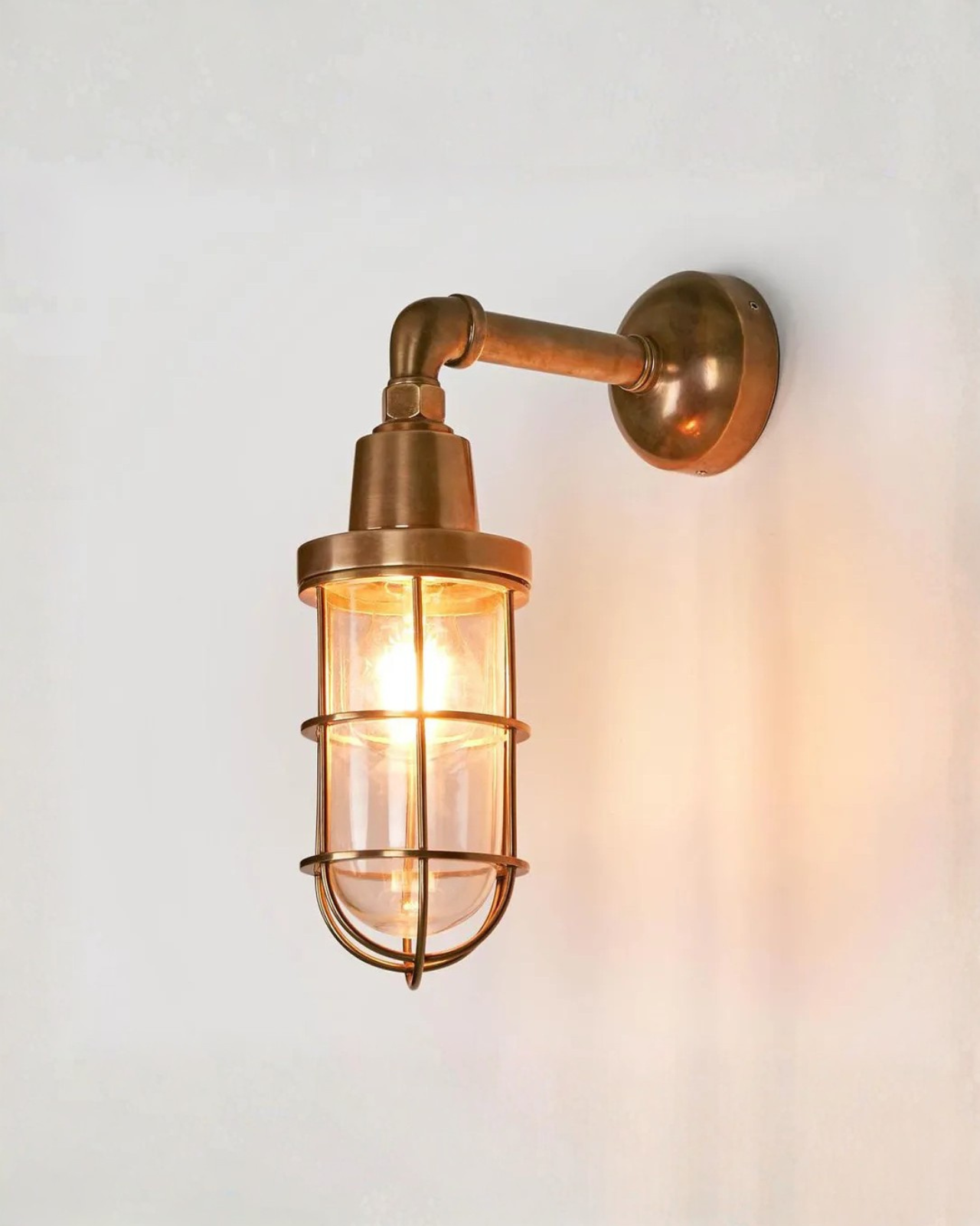 Crafted from solid brass, this ship-inspired outdoor light draws on early 20th-century industrial design, referencing the iconic London Underground fittings of 1910. The hard-wearing protective cage encloses the lamp securely, enhancing durability while reinforcing its heritage character. Finished in antique brass or silver, the fitting pairs well with either a standard globe or a filament-style bulb to evoke the warm glow of historic stations. Rated IP54, it is suitable for both interior and exterior installation, offering lasting performance with classic appeal.