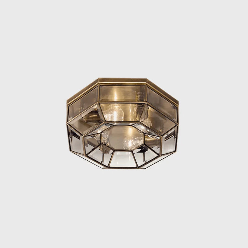 This ceiling light combines the traditional art of bookbinding with modern lighting solutions, bringing together Italian expertise in a stylish and functional way. Available in octagonal or pentagonal shapes, and in small or large sizes, this fixture provides a warm, patterned light suitable for traditional, modern, or contemporary interiors. Made in Italy, using exquisite brass and bevelled glass.