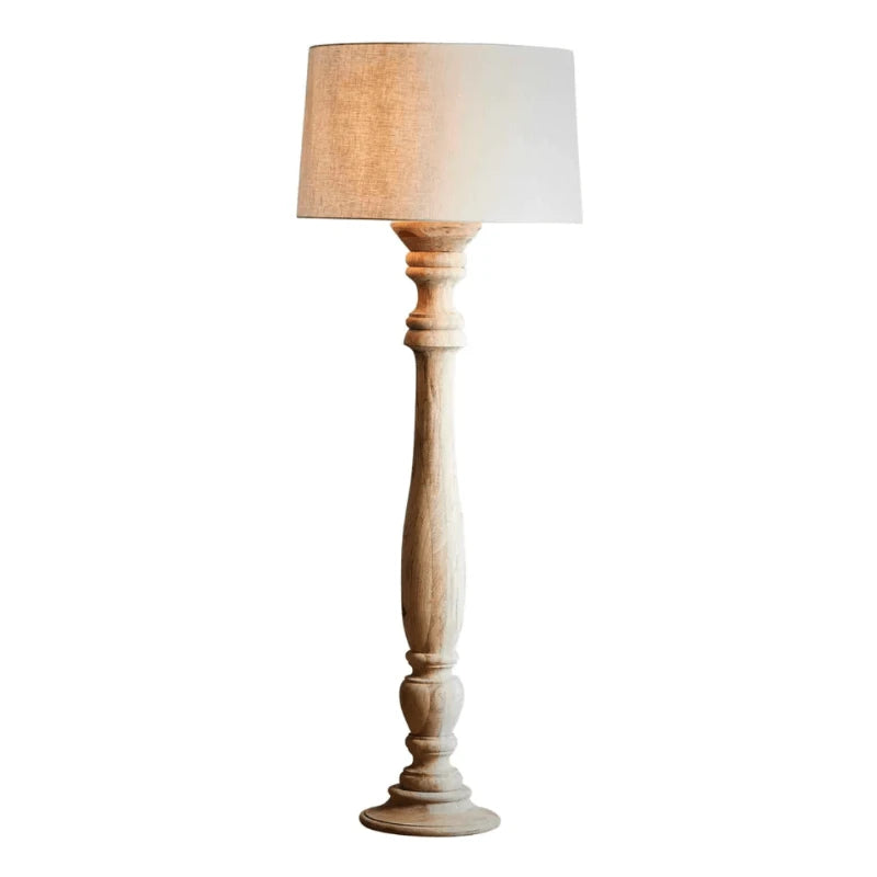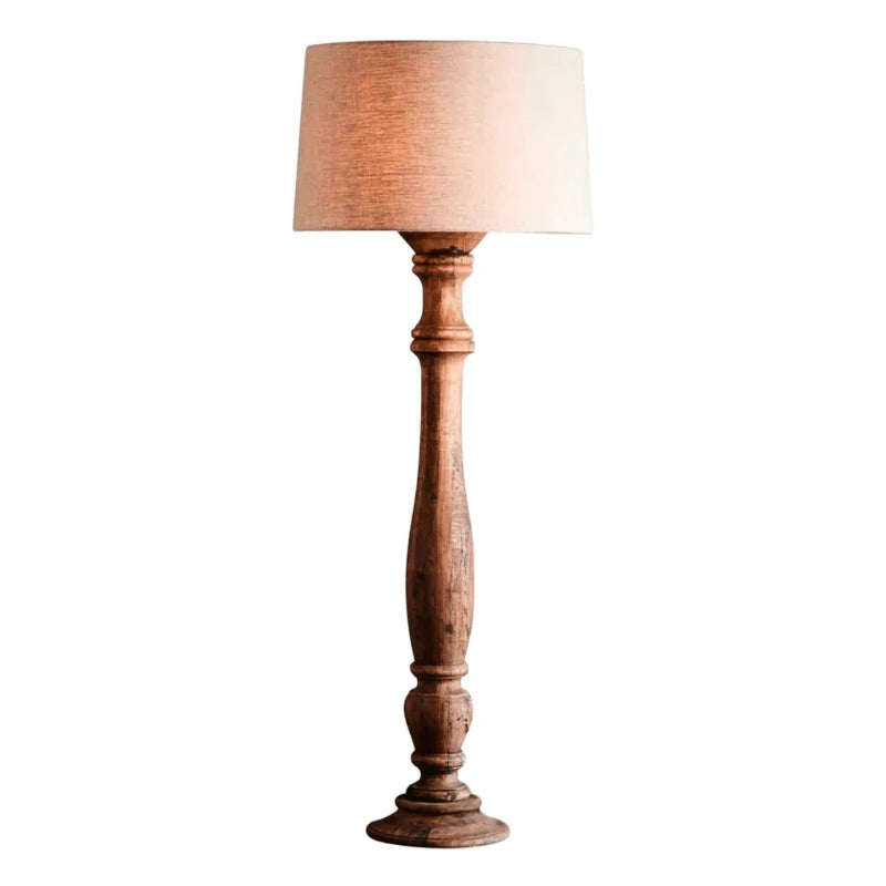 An elegant candlestick style turned wood floor lamp in a dark mango wood, finished with a drum shade in dark natural linen.
