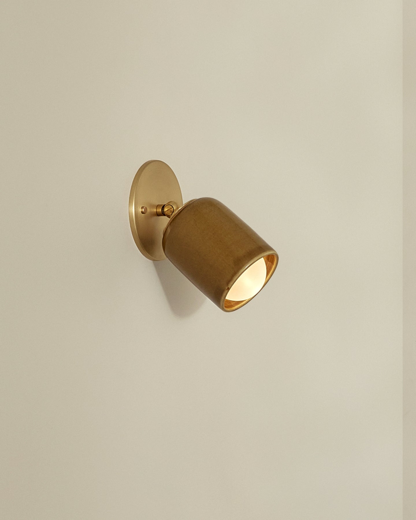 Wall-mounted light fixture with brown shade and metallic base on a beige wall.