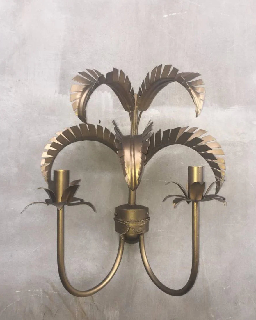 This Handmade palm-inspired scone light features iron shades with leaf blades. Available in two finishes and a matching Chandelier.
