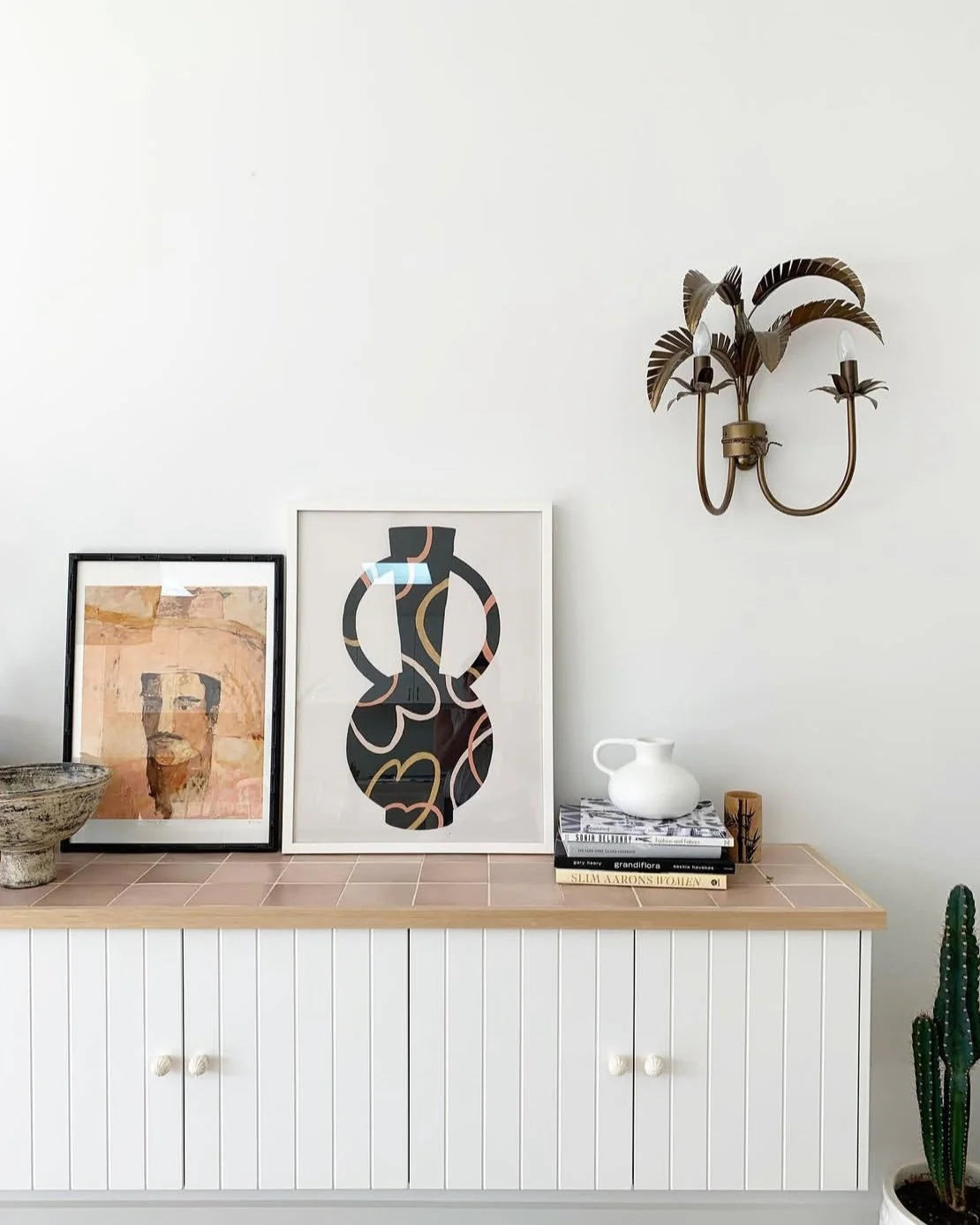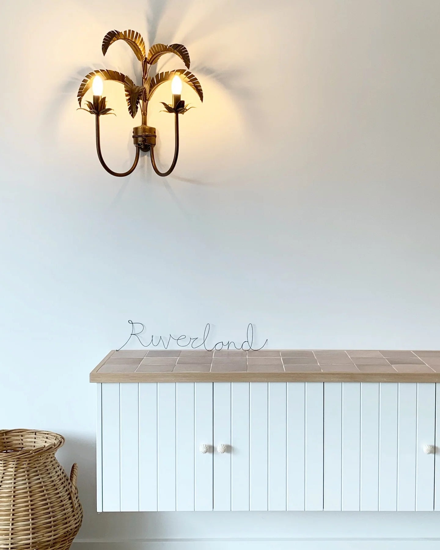 Bronze Palm Wall light above a White cabinet with a wooden top