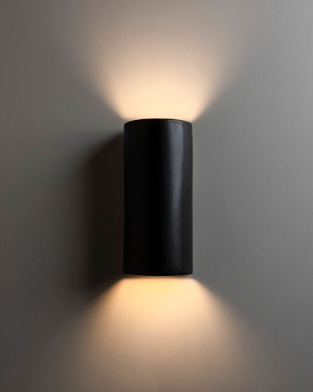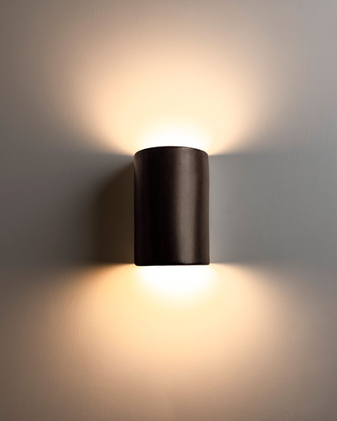 Ideal to create a moody facade in any exterior, this wall light features a curved shade handmade in Tasmania from ceramic and slip-cast. Truly unique, this fixture is inspired from the integration of local timbers and darker facades of Saxon Hall, a renowned distinguished Tasmanian architect. It combines a captivating dark charcoal and nearly black hue with some chocolate and mottled copper tones and with a subtle shimmering metallic finish when bathed in direct sunlight.
